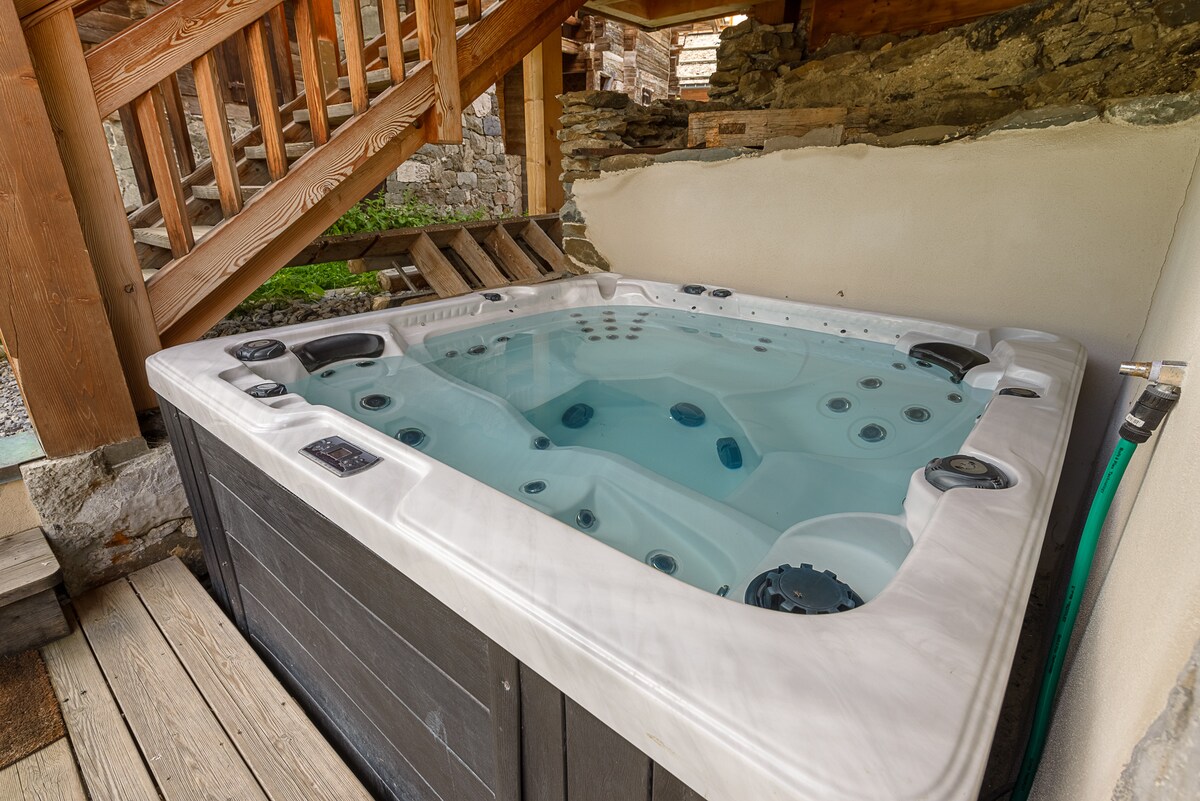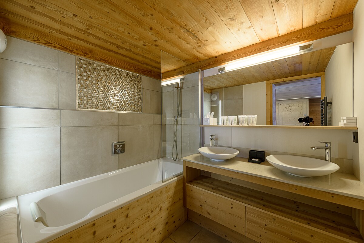 Each half-chalet features a private outdoor jacuzzi to enjoy the surrounding nature. During peak season, guests can also enjoy the warmth of the sauna located on the ground floor. The chalet's uniqueness lies in its modularity, offering two large interconnected apartments: one for 9 people and the other for 13 people. Thus, this luxurious chalet can accommodate an unusual capacity of 22 people! Available amenities include 10 bedrooms, 10 bathrooms, sauna, and 2 jacuzzis. The dining table is designed to accommodate 22 people.