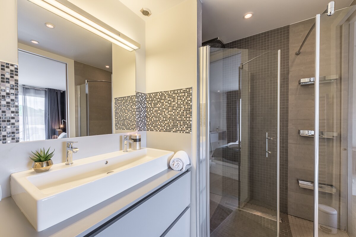- 1 bedroom with double bed (140x190), storage cupboards, air-conditioning and en-suite shower room with single sink