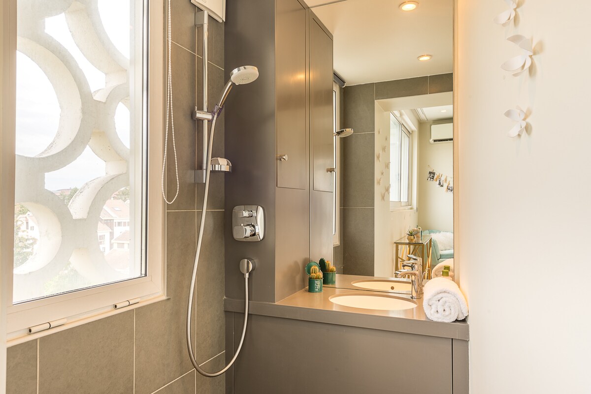 - 1 double bedroom with queensize bed (160x200), Tv, speaker, air-conditioning and en-suite shower room with single sink