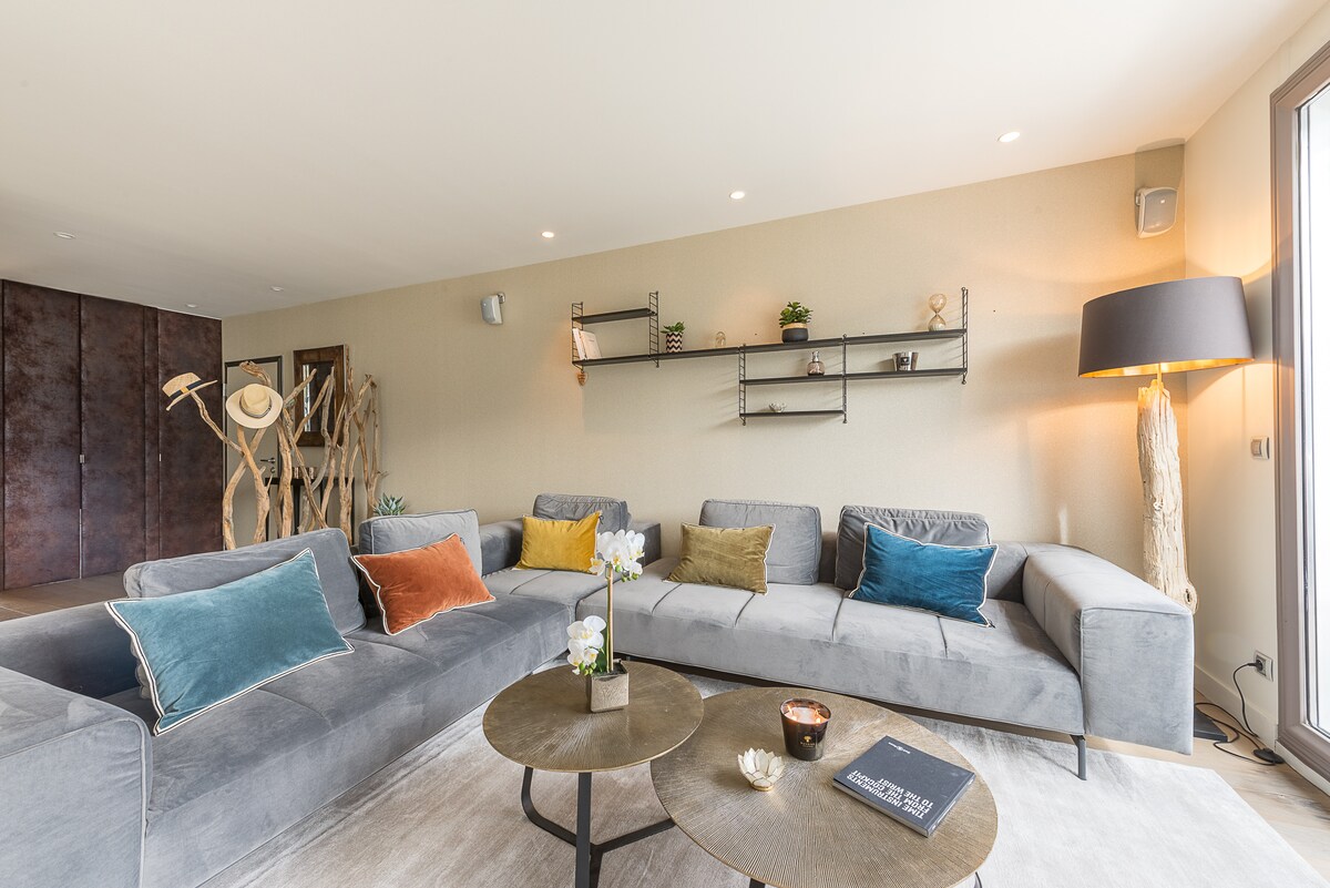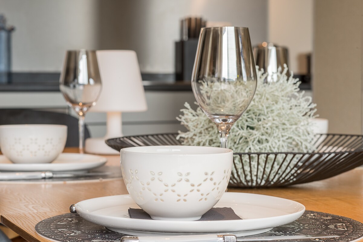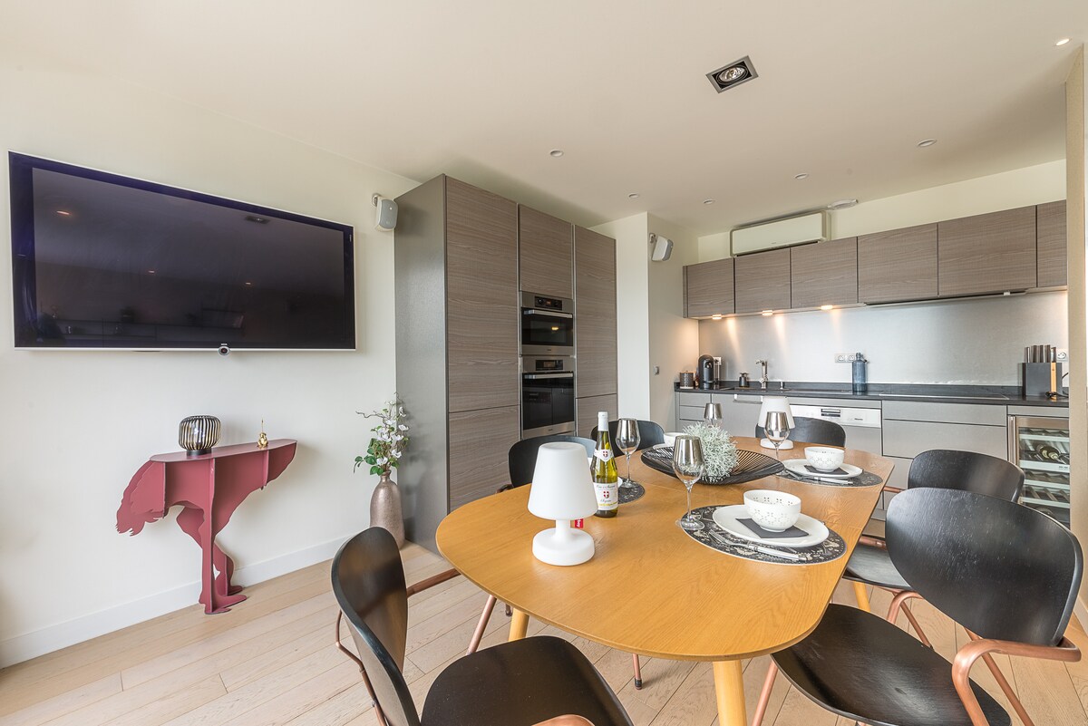 - Spacious and bright living room: a sitting area with corner sofa overlooking the lake, a dining table seating up to 6 people and a fully equipped kitchen (cooking utensils, crockery, coffee machine, kettle, toaster, fridge, oven, microwave, raclette machine, fondue machine...). Direct access to sunny terrace with magnificent panoramic view of Lake Annecy (garden furniture present: round table for 4 and outdoor seating area).