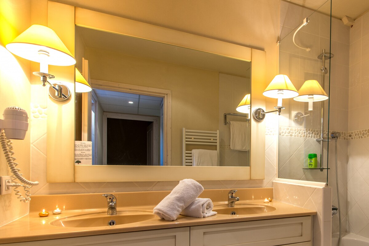 - Separate bathroom equipped with bathtub with glass shower curtain, double washbasin, hairdryer,