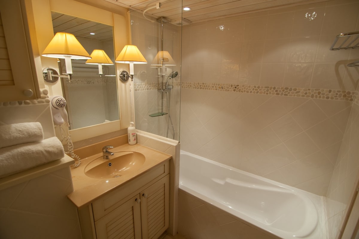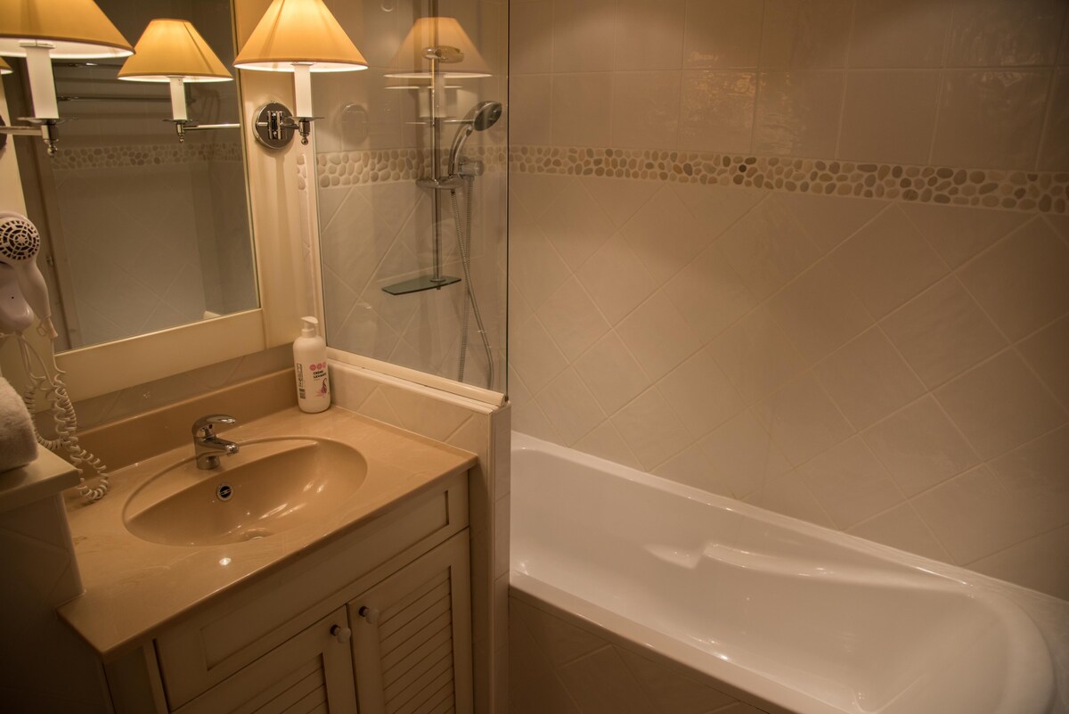 - Separate bathroom with bathtub with glass shower curtain, washbasin, hairdryer, 1 Wc