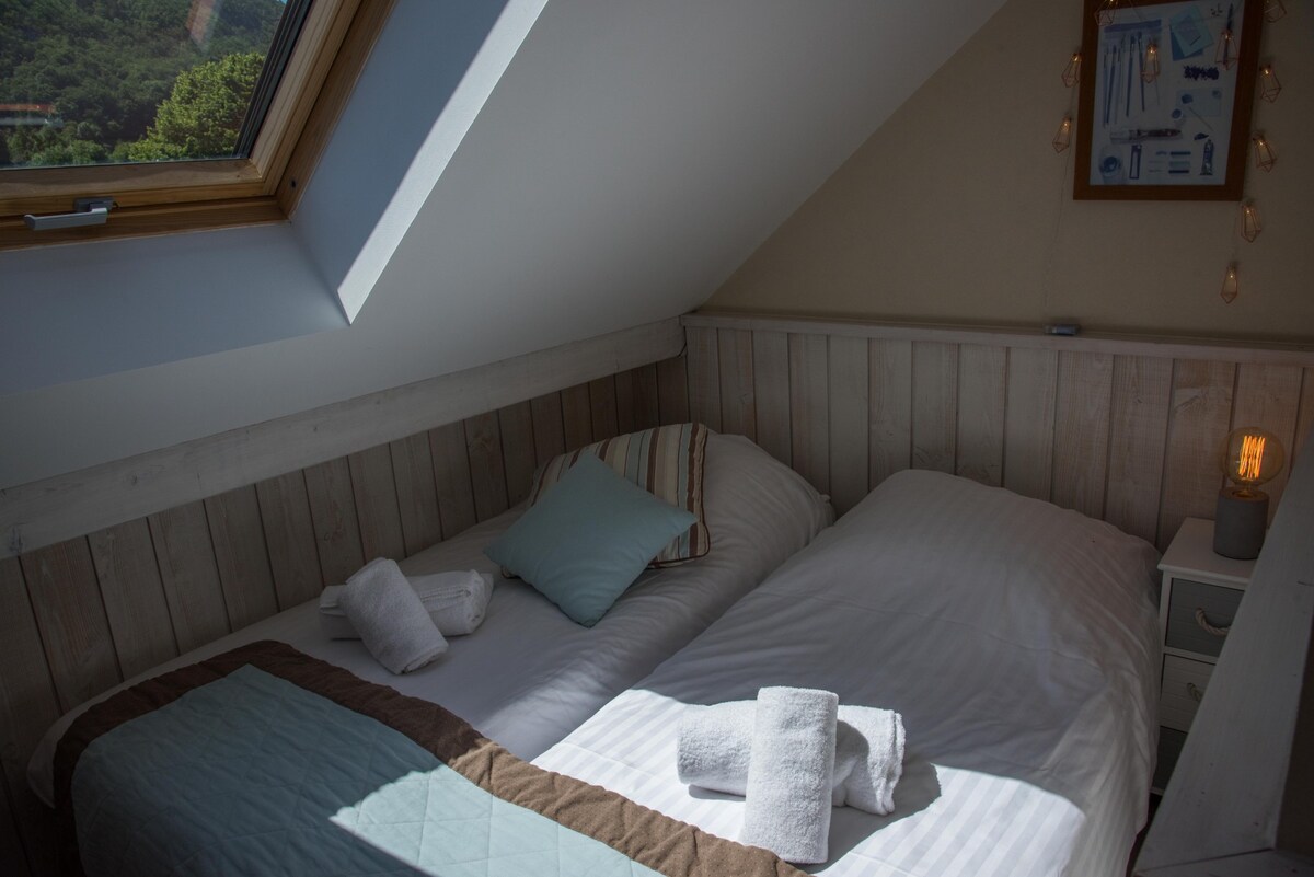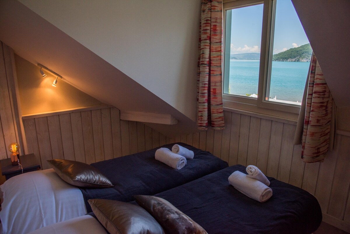 - 1 bedroom with 2 single beds (80x200cm) that can be joined together, storage cupboards, lake view and en-suite bathroom with shower and washbasin