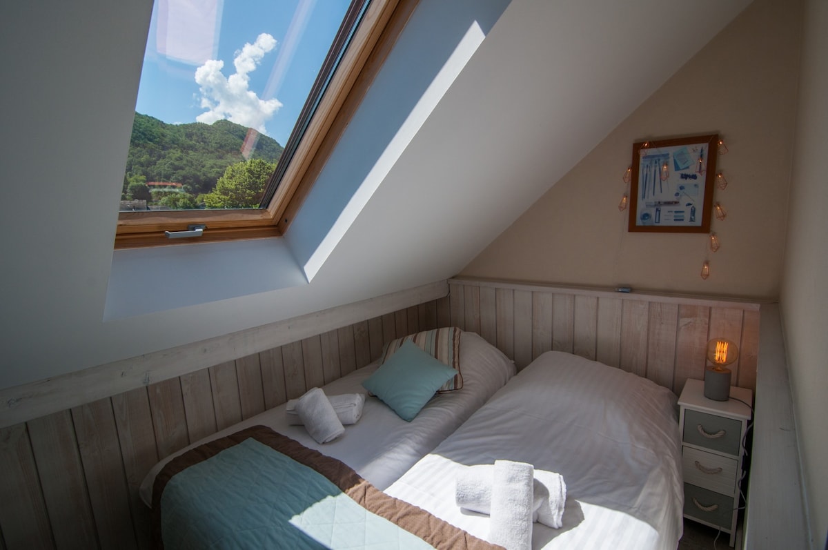 - 1 bedroom with 2 single beds (80x190cm), mountain view