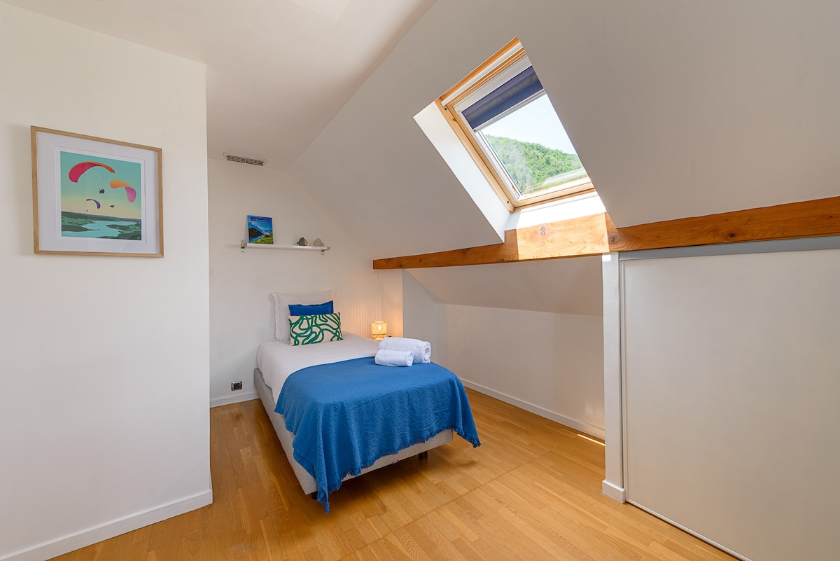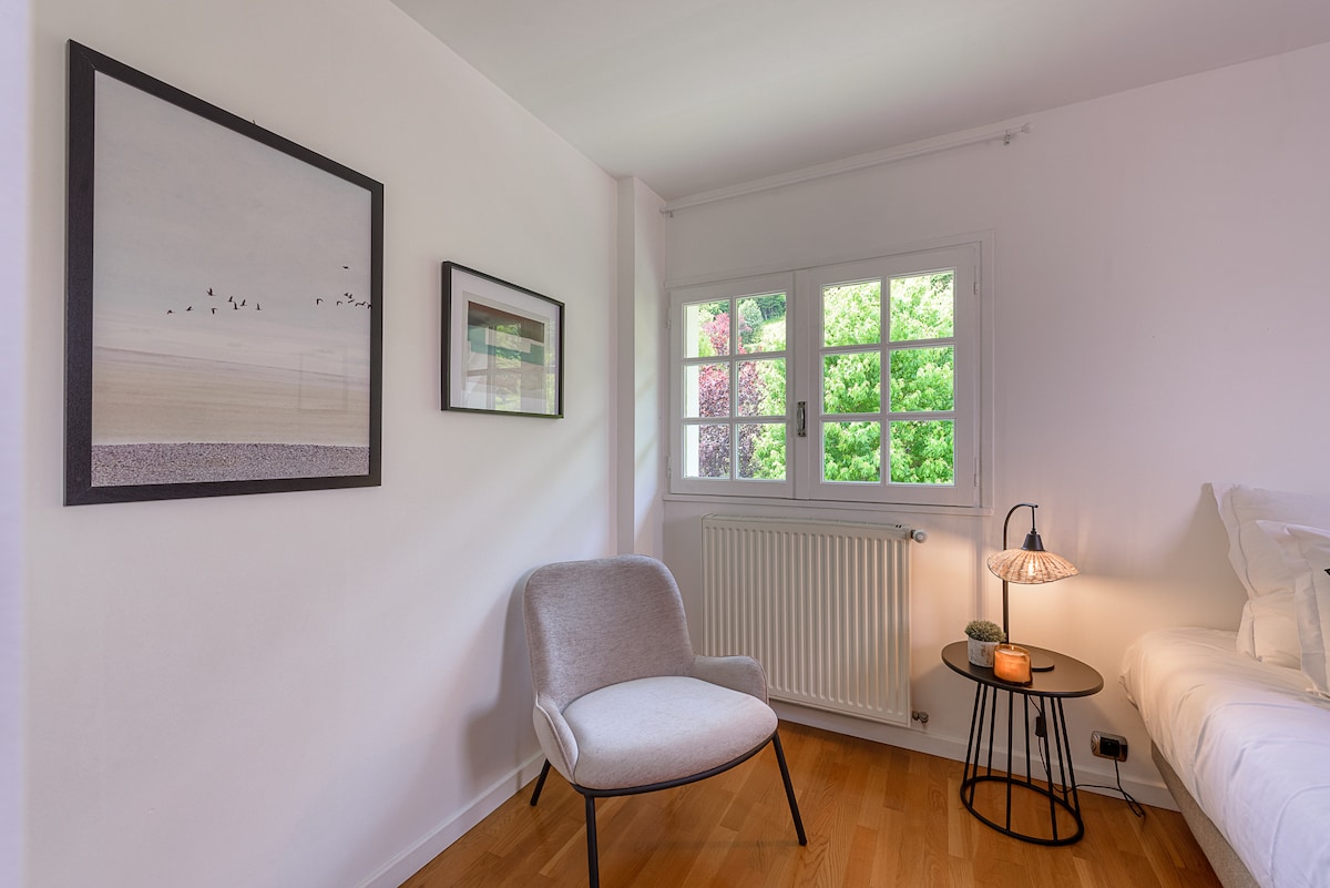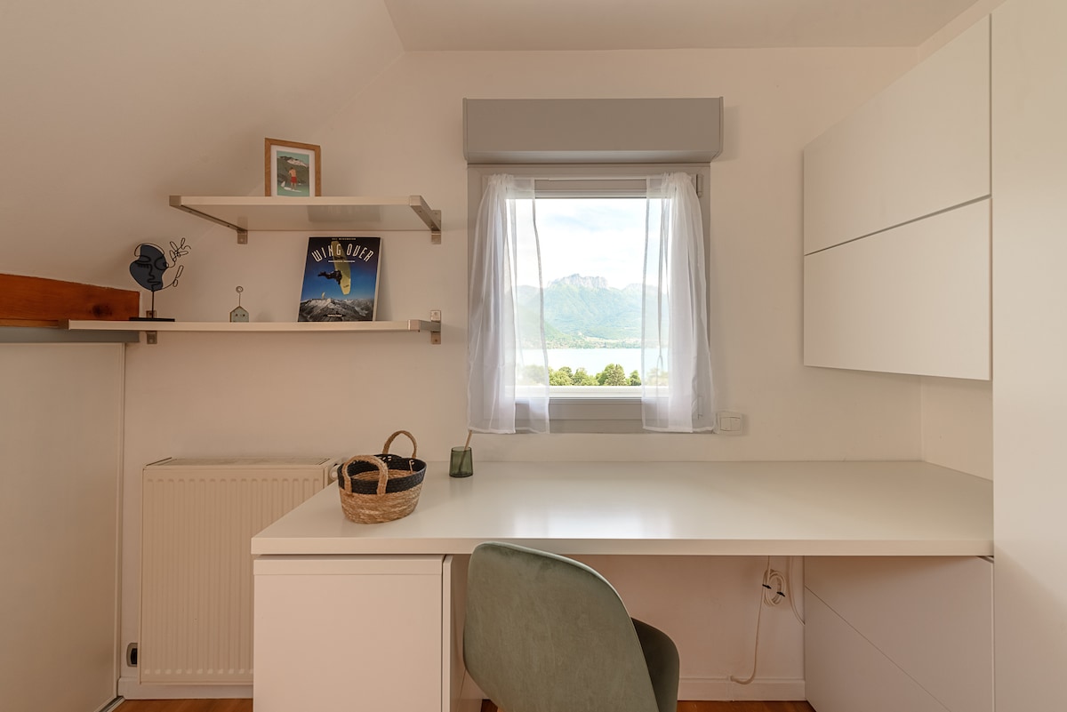 - Bedroom n°3: 1 single bed with desk, storage closets, and lake view