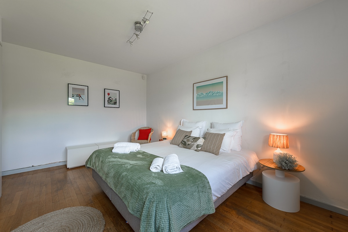 - Bedroom n°4: 2 single beds that can be joined together, desk, storage closets, and balcony access with lake and mountain views