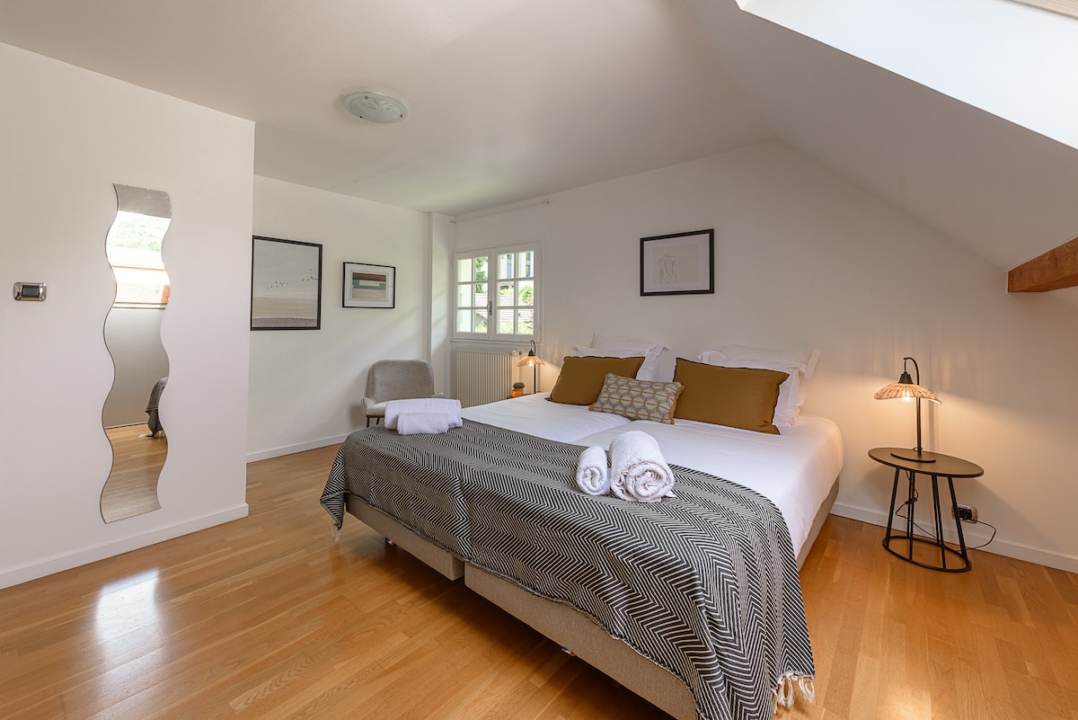 - Bedroom n°1: 1 Queen-size double bed, storage closet, and lake view