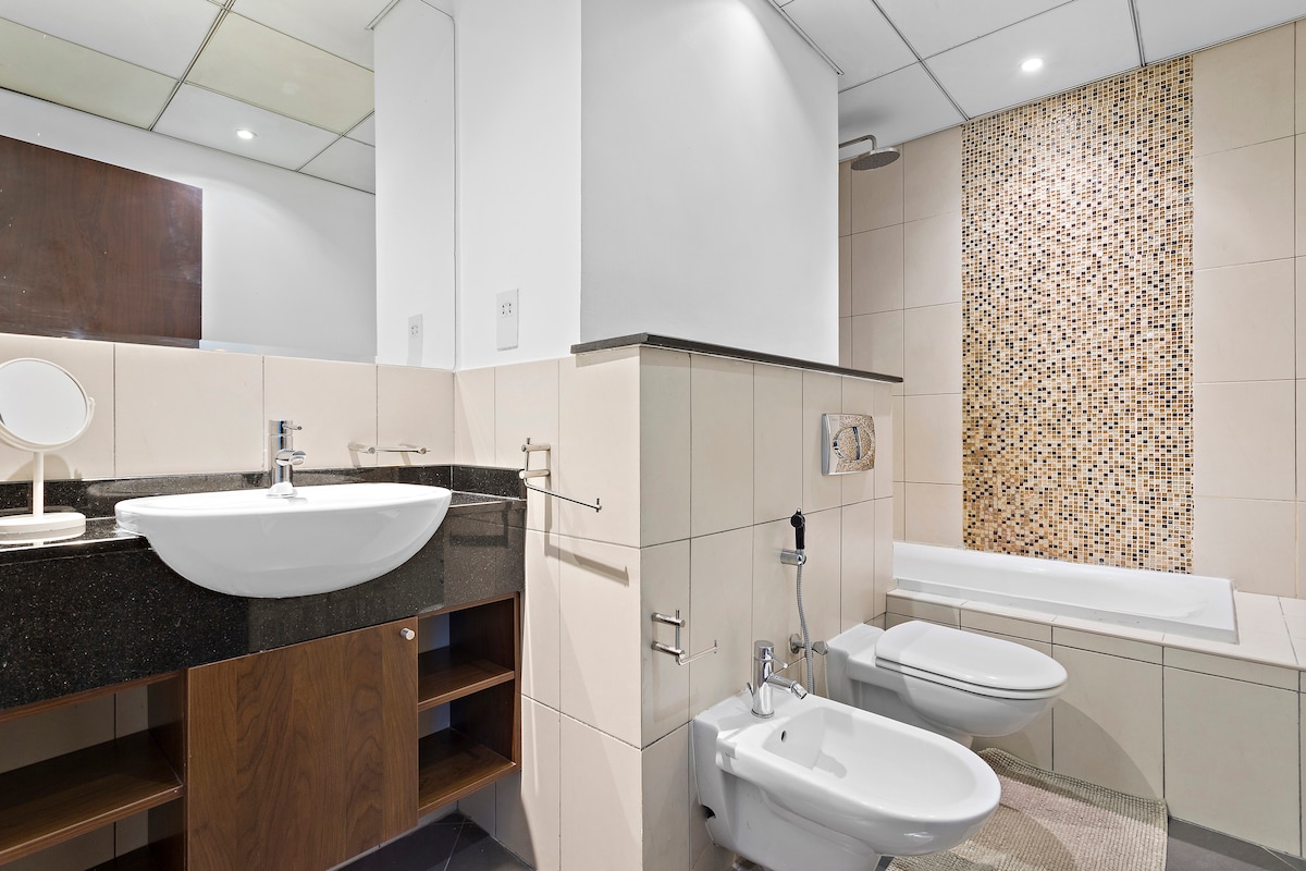 Everything you would need during your stay is at a walkable distance. However, there is a taxi service 24/7 in the building. The tram is at a distance of 5-7 minutes walk, and metro and bus stations are also very conveniently accessible.Other things to note