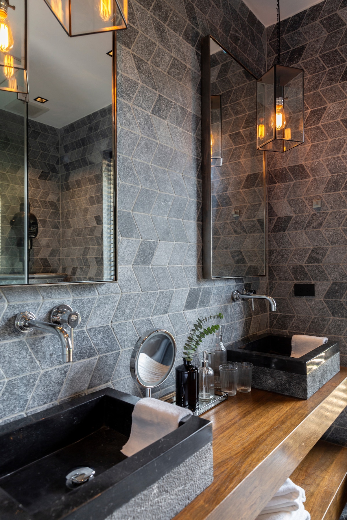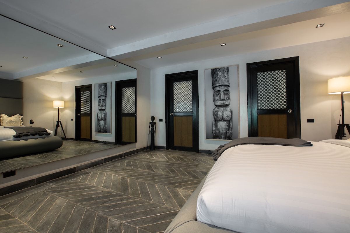 Bedroom 4 is a detached, serene oasis beneath the pool, featuring a king-size bed, sofa bed, ensuite bathroom, and flat-screen TV. Its secluded location makes it an ideal escape for couples or families seeking privacy.