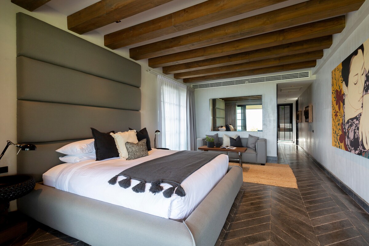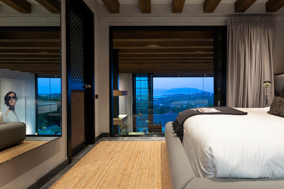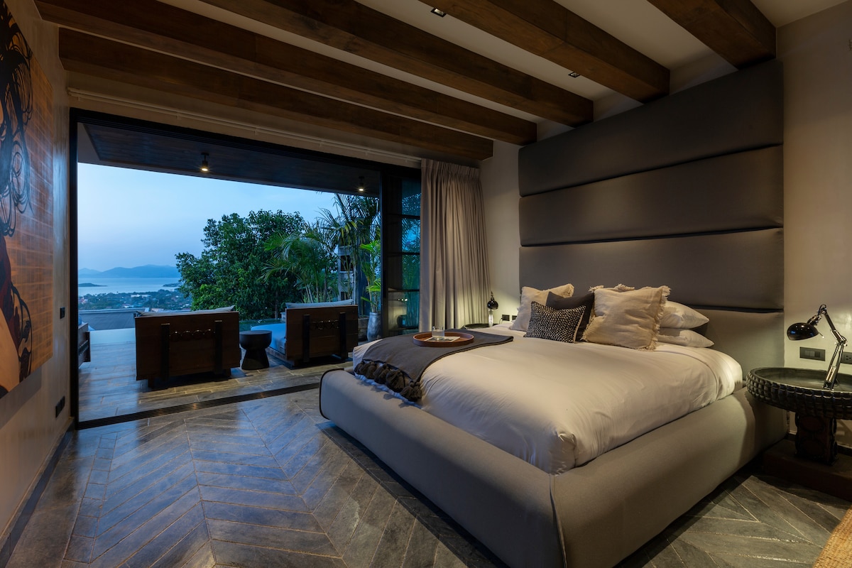 Bedroom 1 at Villa Sierra is a luxurious ground-floor room that opens directly to the pool. It features a king-size bed, ensuite bathroom with a large bathtub, flat-screen TV, and sofa, offering a private poolside retreat perfect for couples.Bedroom 2, located on the second floor, includes a king-size bed, ensuite bathroom, flat-screen TV, and a private balcony with two chairs. Enjoy serene views of Koh Samui from this cozy, family-friendly space.