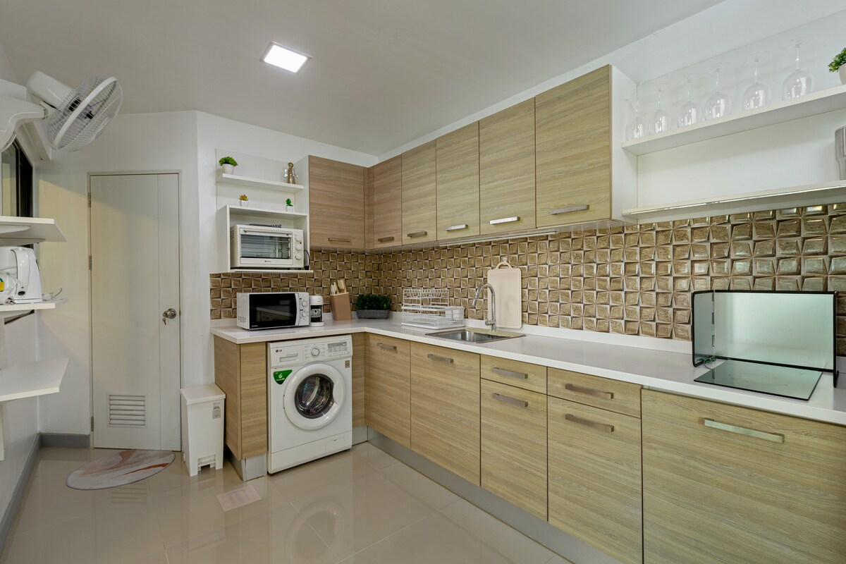 our modern kitchen equipped with electric stove, washing machine, utensils, coffee maker, toaster, iron and iron board.