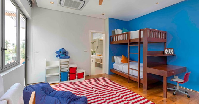 Each room that comprises Villa White Skies is well-appointed. From the Master Bedroom, guests will walk through a stunning glass hallway with hanging wooden ceiling lamps to reach a children’s bedroom on the left. This bedroom is fitted with bunk beds and has extra space for a nanny’s bed or a baby cot. An en-suite bathroom with a refreshing rain shower and jacuzzi bathtub connects the children’s bedroom to guest bedroom 1. These two bedrooms are ideal for parents as the children remain in close proximity while everyone is able to have privacy. Guest bedroom 2 with en-suite bathroom is further down the hallway on the right, and features an additional sofa bed (extra charge applies) in the corner of the room.The large living area of Villa White Skies features floor-to-ceiling glass doors, making for a seamless connection between the inside of the villa and the outdoor area. The villa has both an indoor and outdoor kitchen. Fully functional and super convenient, the kitchen area makes it possible for guests to prepare light meals by themselves. However, for guests who would like to indulge, guests can ask the in-house cook to prepare a delicious Thai meal for them. This excellent service is available daily from 7am until 5pm for an extra charge, with guests paying their own ingredient costs and 20% shopping fees to the staff.