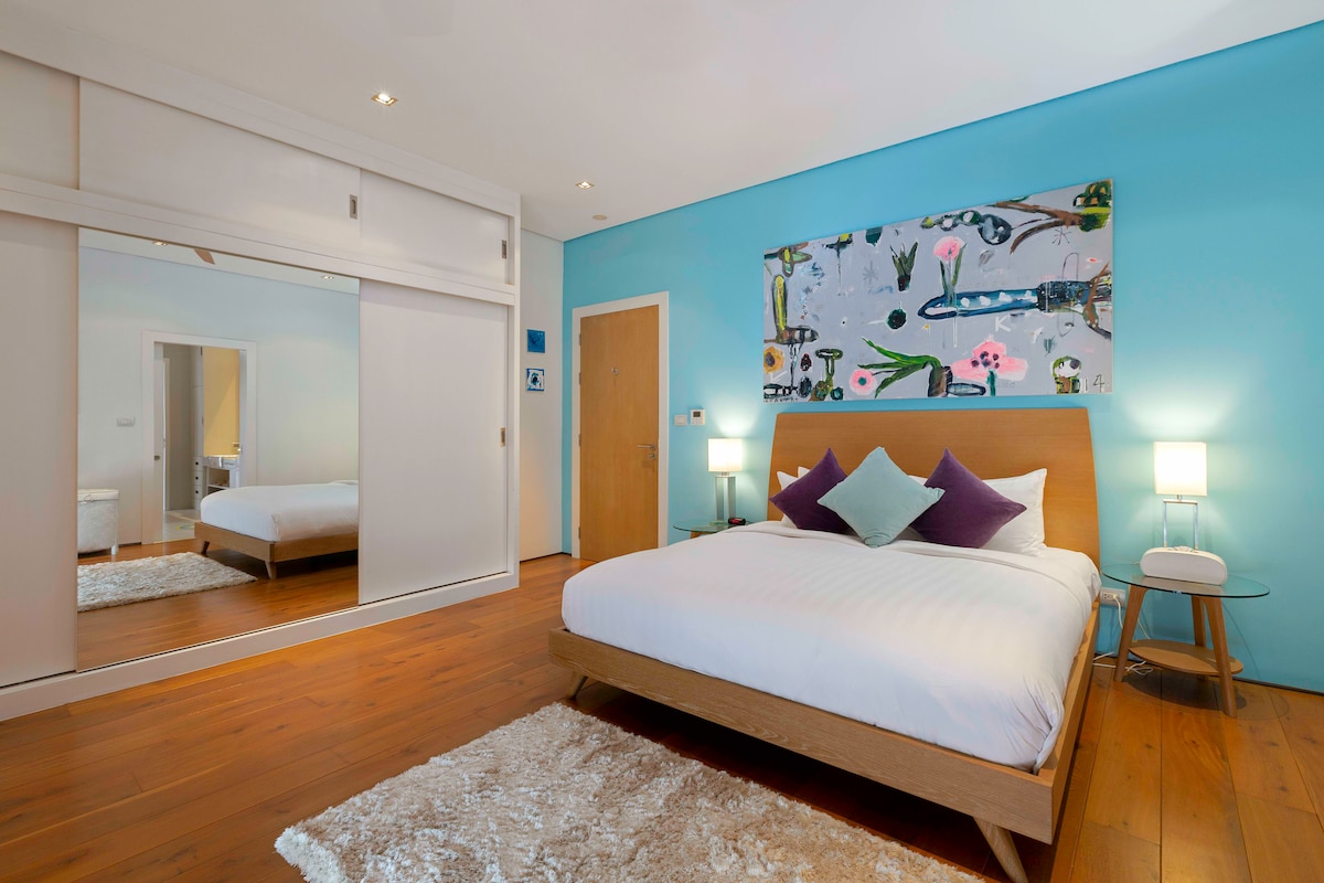 Designed as a fully functional family home, Villa White Skies features a contemporary design. The spacious villa is enhanced by modern art pieces and stylish furnishings.The villa boasts a unique L-shape which features an expansive swimming pool as its centerpiece. The pool features a spring board at the maximum depth of 2.5 metres, which is sure to bring hours of fun to the children who are excited to splash and play during their holiday. The villa comes fully equipped with essential beach toys such as floats, beach balls and kickboards. A lovely green space surrounds the pool area, which makes it the perfect spot for those traveling with a small family pet.