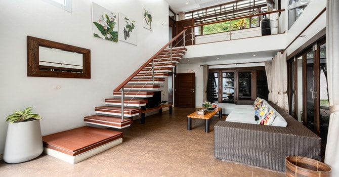 EXPLORE THE VILLAAs soon as you enter through the arch, you will notice that this is a property with a unique and stylish edge. A standalone office building is to the left, and in front of it is a lawn and garden area with large brown and green ceramic pots. The first pavilion, which features tiled floors and a tall, sloping glass roof, may be reached through a sandstone path. The living area, which has opening glass doors on three sides, is the focal point and features a truly huge L-shaped sofa. The TV, cleverly placed in the nook of the floating staircase leading to the second story, is facing the sofa. A living space with a bamboo pod chair and orange cushions is located in front of the door.