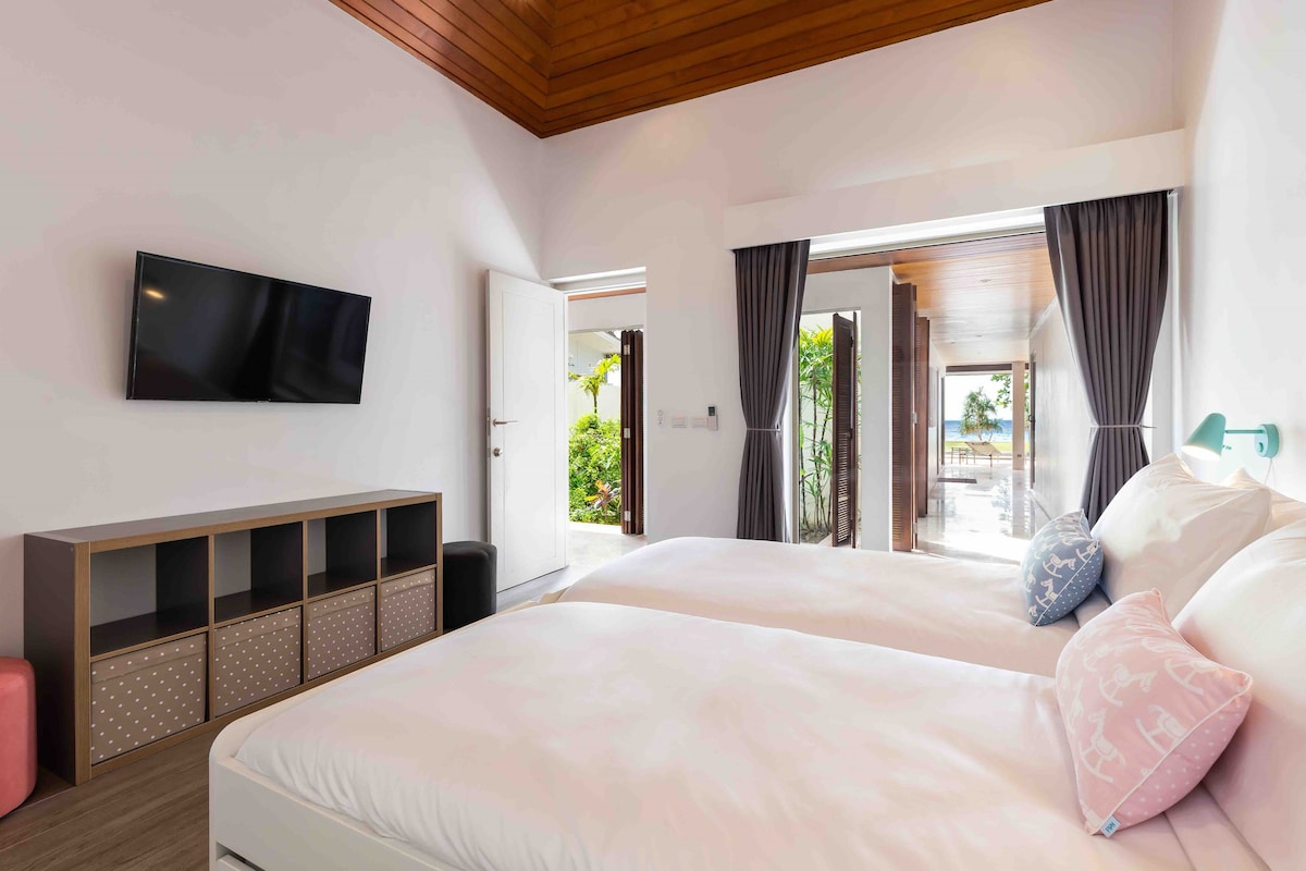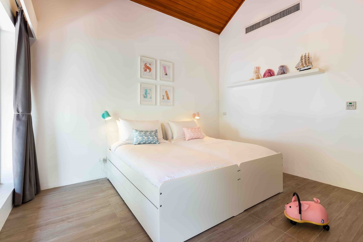 The villa features two master bedrooms, en-suite bathrooms, and floor-to-ceiling windows offering stunning ocean views. Two additional bedrooms, each with a Queen-size bed and en-suite bathroom, are decorated with images of the Scandinavian archipelagos and set back from the garden. The children's room comes with twin beds that convert into four single beds, creating a perfect sleepover experience, complete with its TV. A sixth smaller room can be set up for another child or nanny.