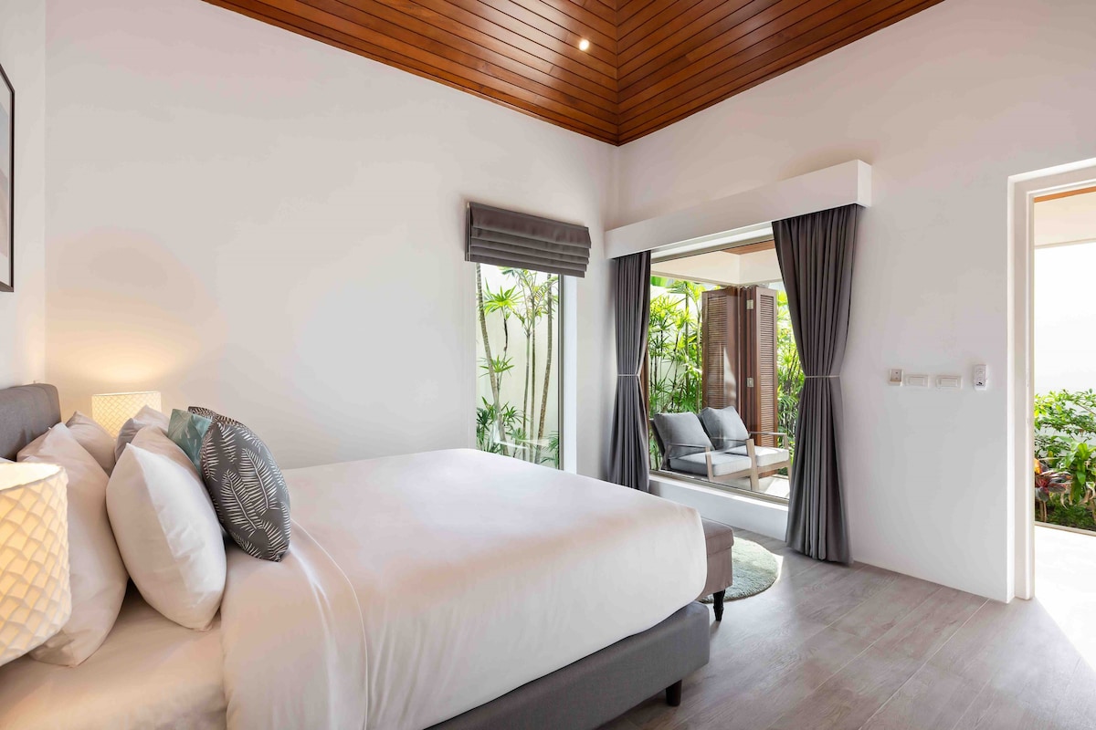 The focal point of Villa Sand is the expansive outdoor terrace that overlooks the lush garden and the ocean. A modern dining table accommodates ten for alfresco meals, while a separate lounge area invites you to unwind as you watch the sunset. The swimming pool, surrounded by sun loungers, offers a refreshing escape with unbeatable views of the Andaman Sea.