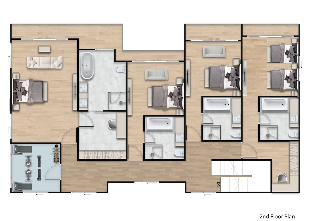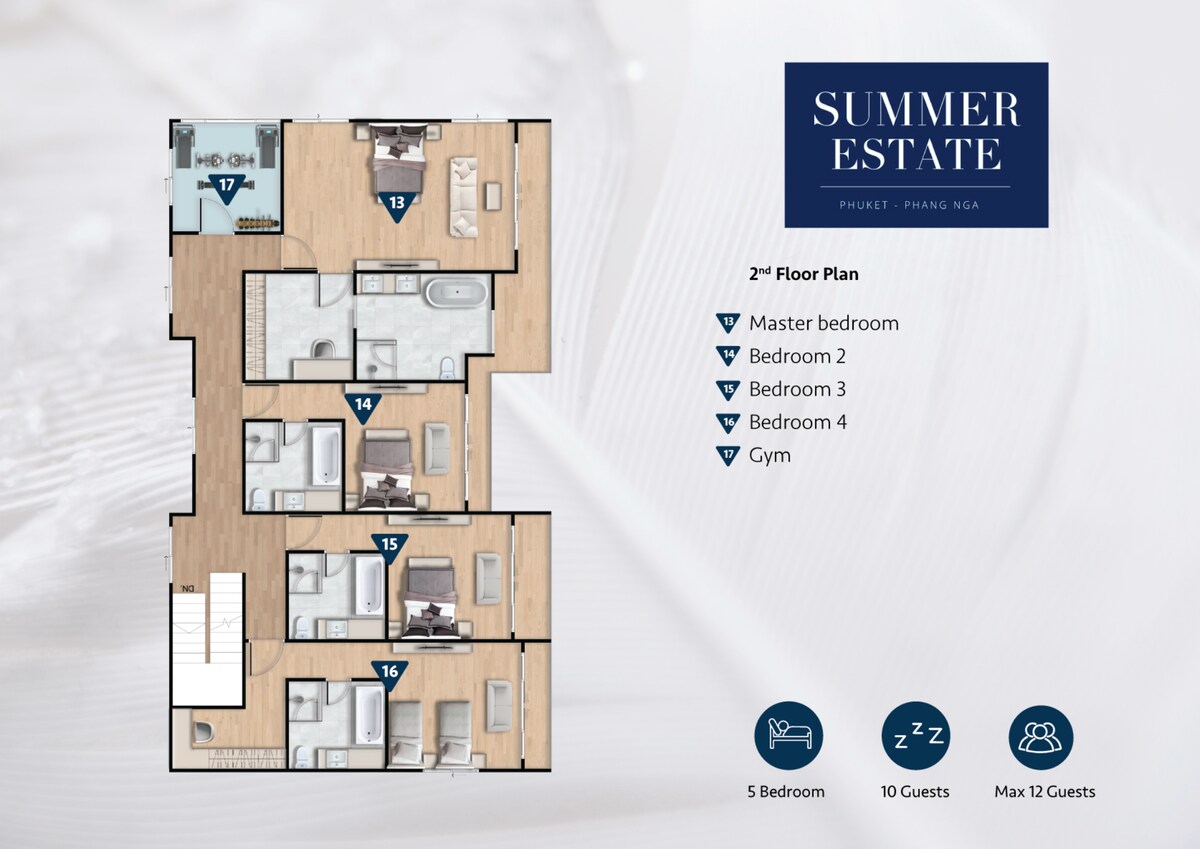 The second floor is where 4 of the 5 bedrooms are located. The huge 81 sqm Master Bedroom with walk-in closet and Jacuzzi bath tub. Two guest bedrooms with King beds and another guest room with two Queen beds. There is also the private gym with Life Fitness equipment on this level.