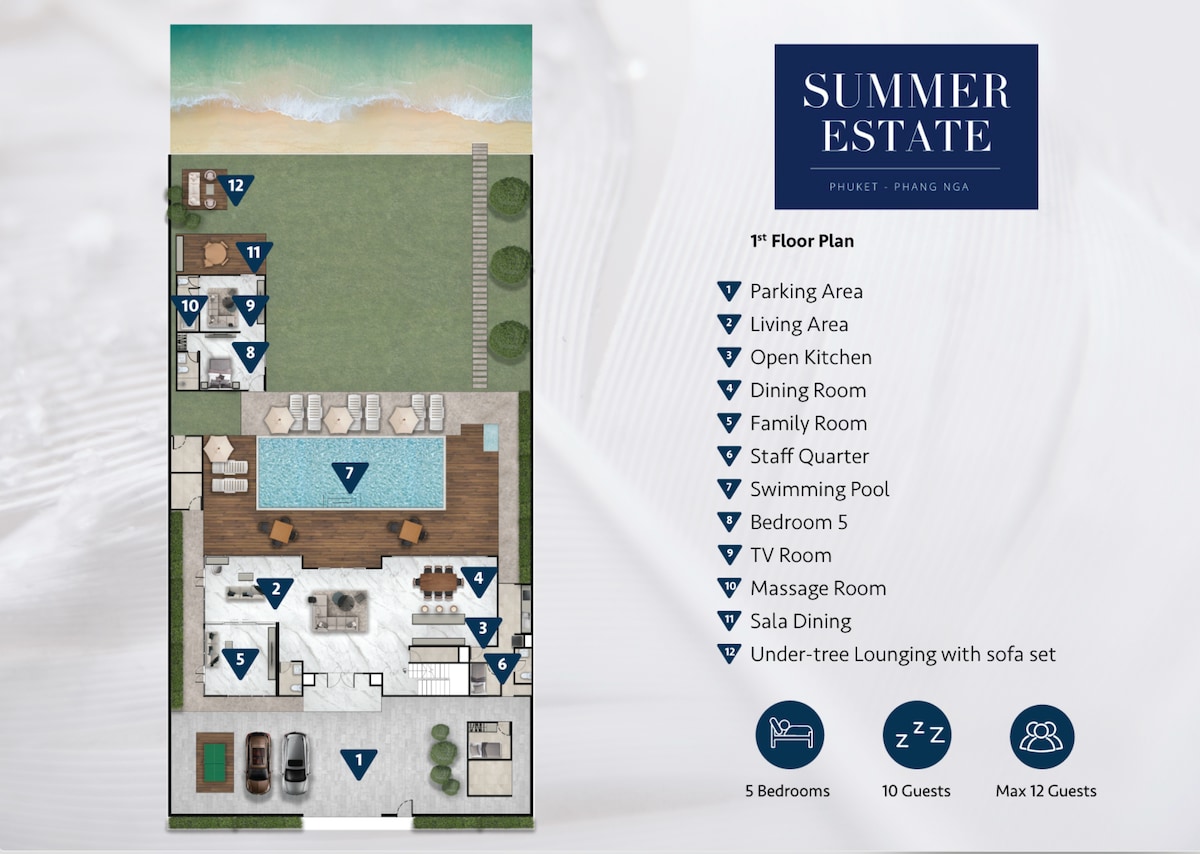 Summer Estate strikes the perfect balance between comfort and luxury, lending itself as the ideal setting for your perfect holiday getaway.The first floor of the villa with a total of 215 sqm of living space is where you'll find the living room, open kitchen with dining room, and a family room. With full length folding glass doors this living space can be opened up directly to the pool deck.