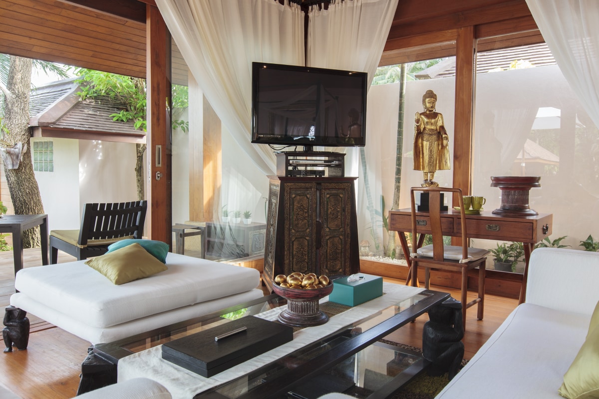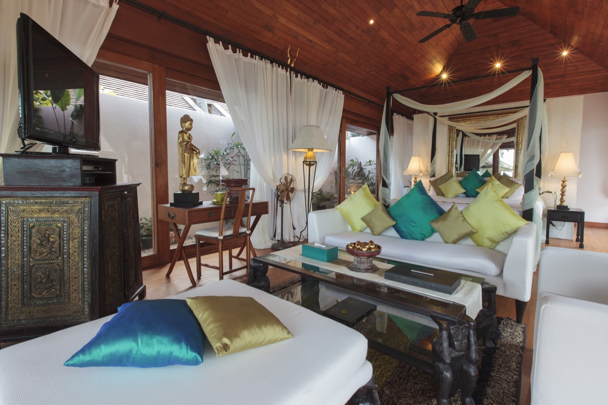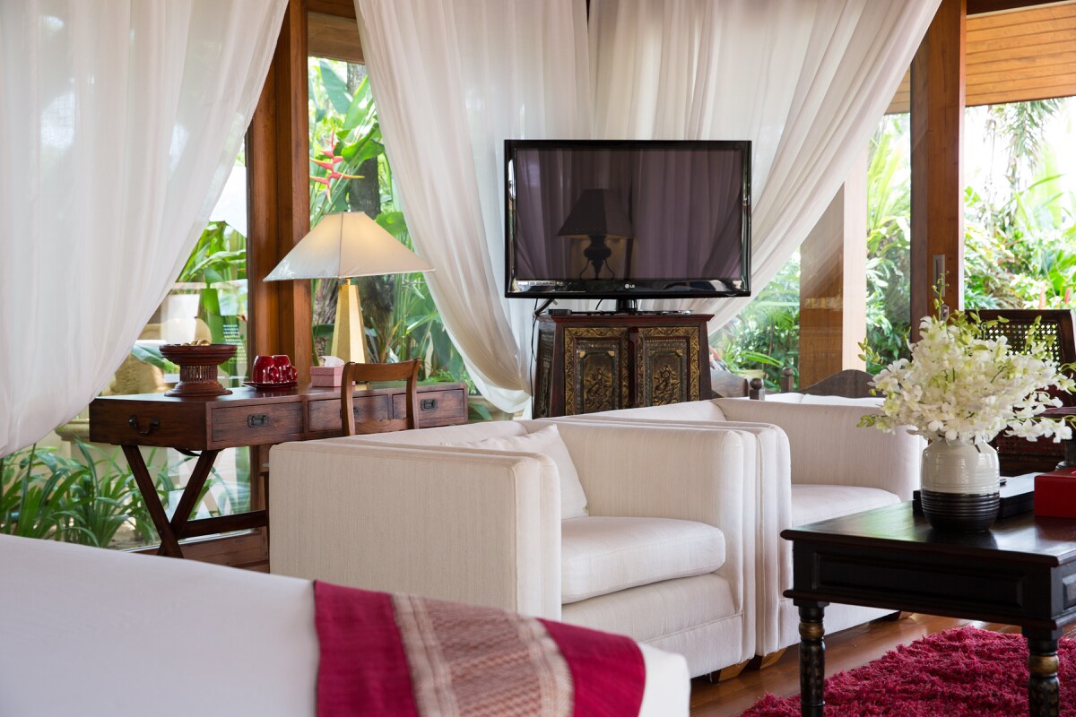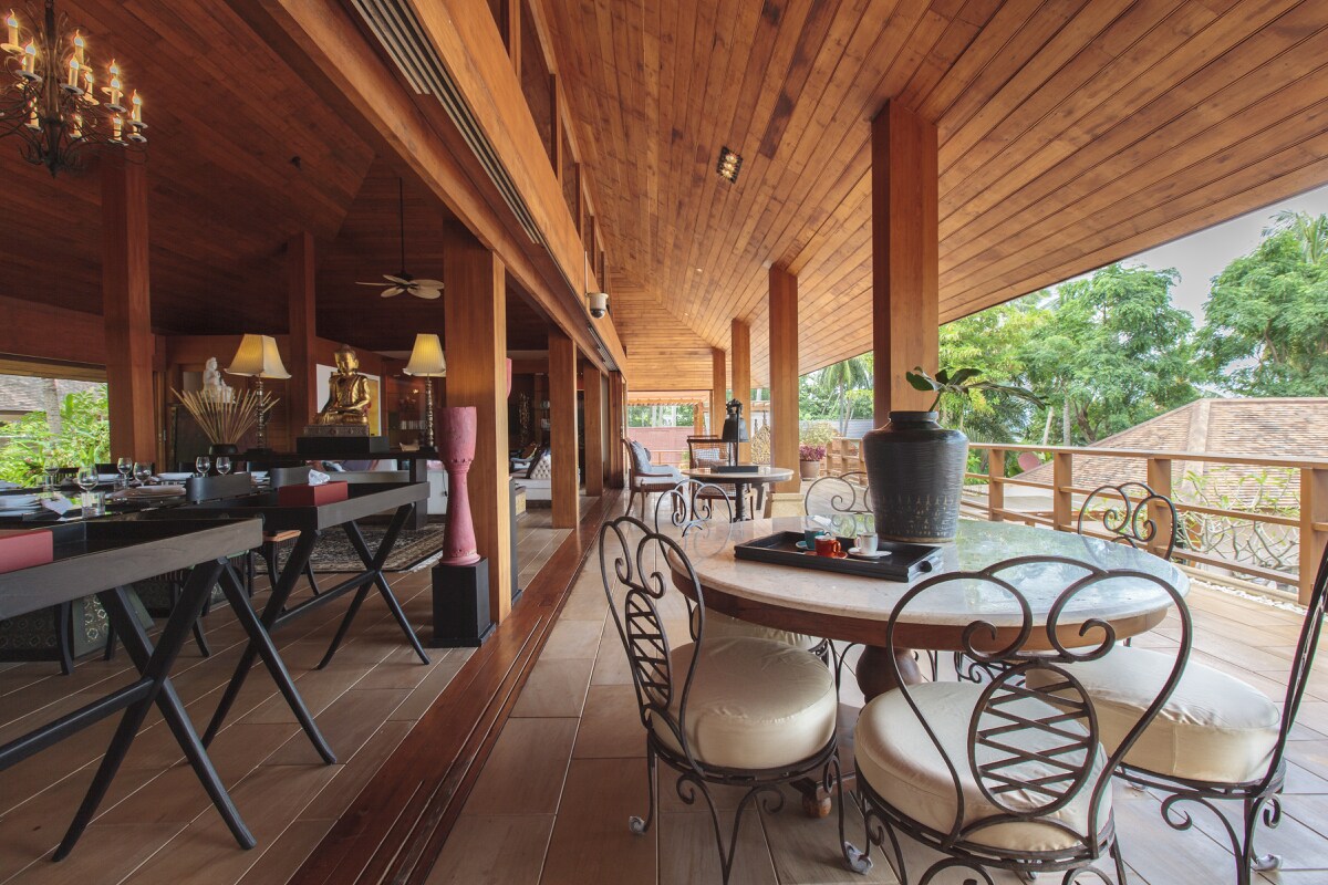The sumptuous lounge area featuring a high ceiling with fans has large sofa seating for up to 25 persons, 48” LCD, with an extensive DVD & book library. A simple natural palette spiced with warm vibrant colours and exquisite 100-year-old far eastern antiques, allow this stunning space to speak for itself, as it entices guests to relax and unwind.