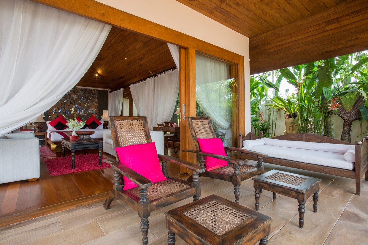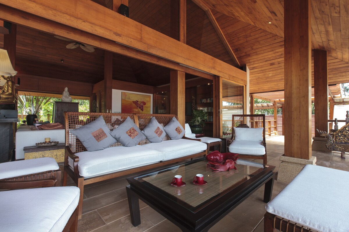 The butterfly ponds abundant with lotus flowers and steppers, pave the way to the vaulted living space, centre stage in the villa. Large sliding doors concertina back in a unique design dissolving any distinction between indoor and outdoor living.