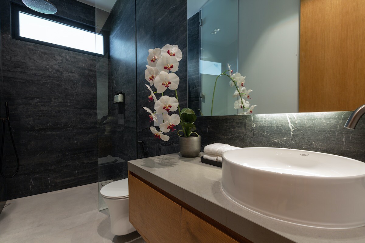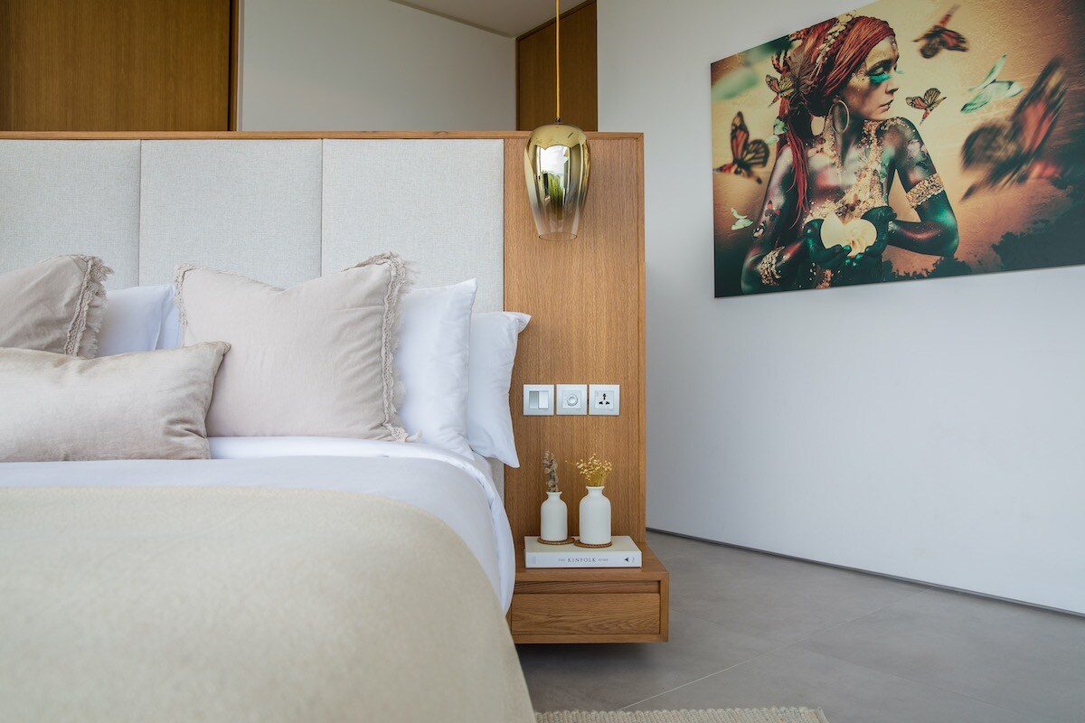 The bedroom interior style is contemporary with some tropical influences, using natural oak and stone throughout. Three of the bedrooms are located on the second floor and one on the first floor. The master bedroom has floor-to-ceiling sliding doors leading out on the sun terrace, overlooking the infinity pool, the sea, and the island Koh Matlang. Guest bedroom 1 with floor-to-ceiling windows offers a breathtaking view, overlooking the sea and the mountaintops. The Garden room on the lower level has floor-to-ceiling sliding doors opening up to a private terrace and garden with a breathtaking sea view. Each bedroom has its own en-suite facilities with the master bedroom having a stand-alone bath.