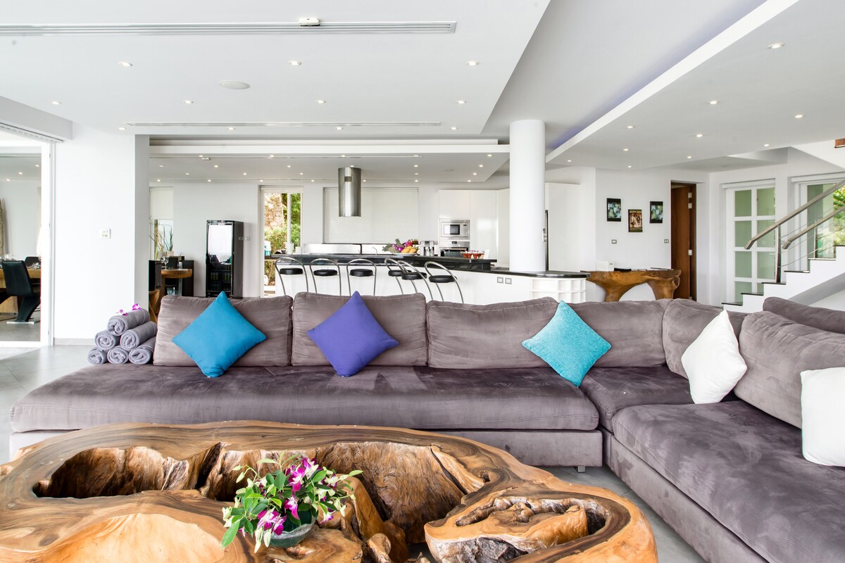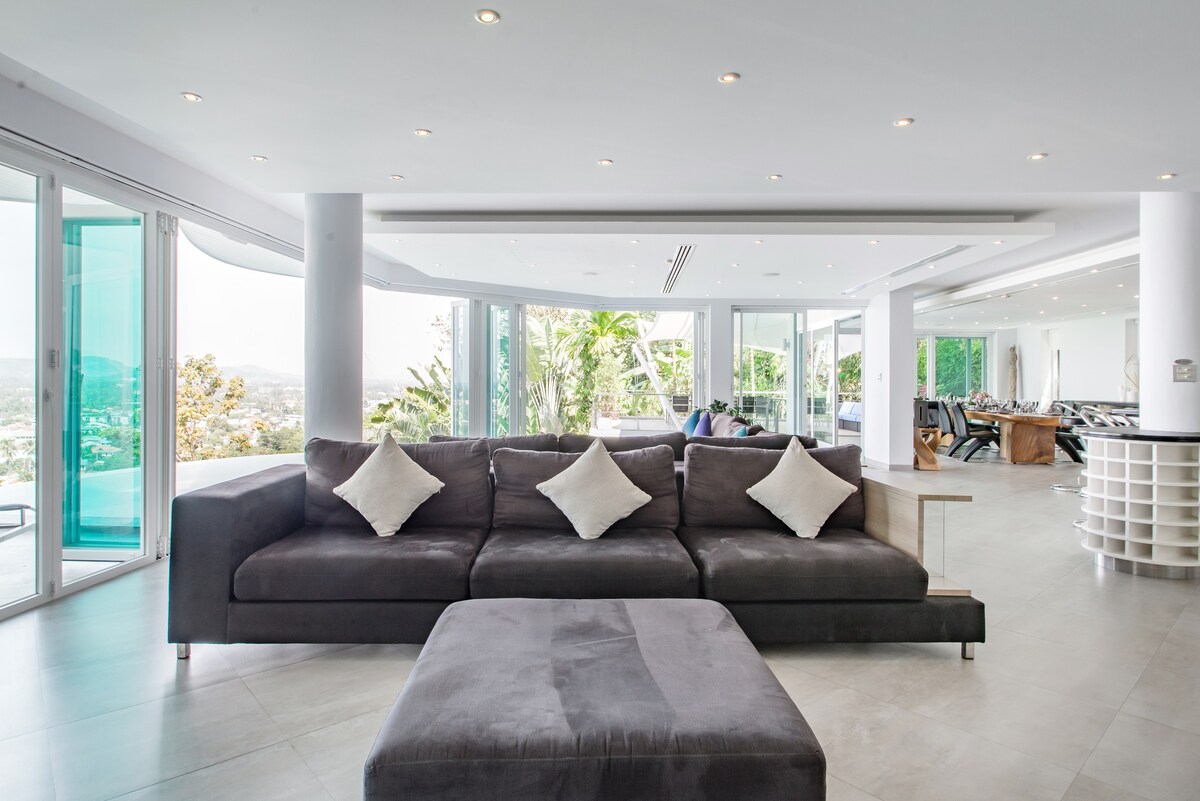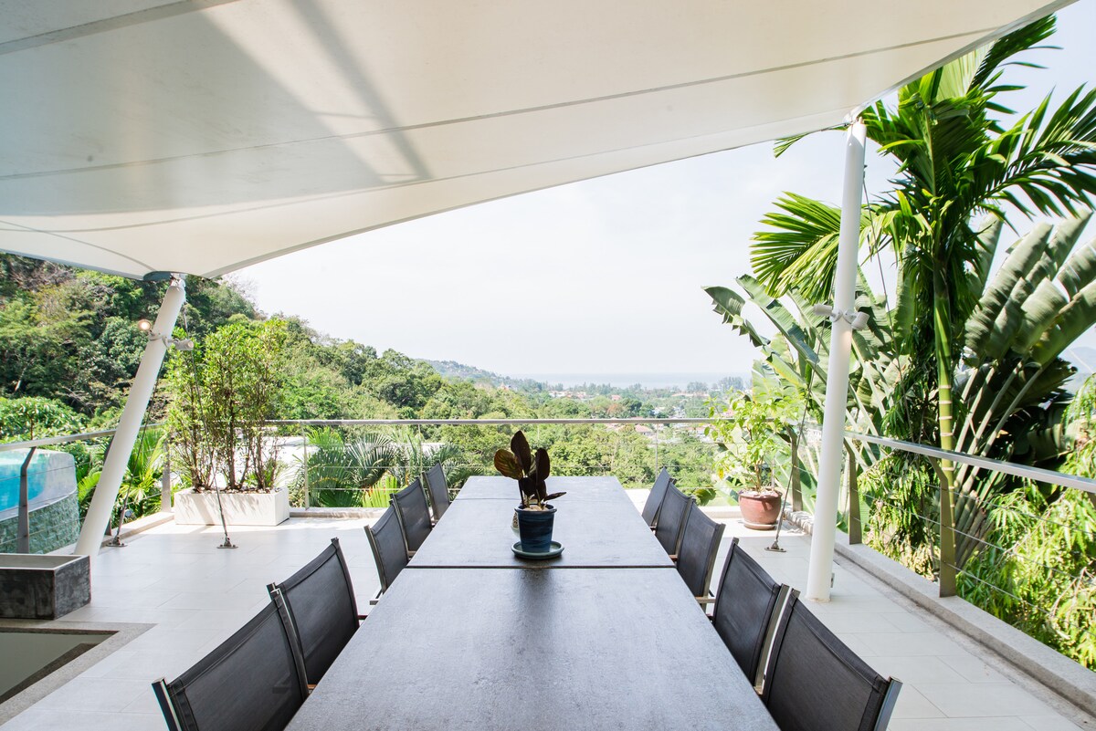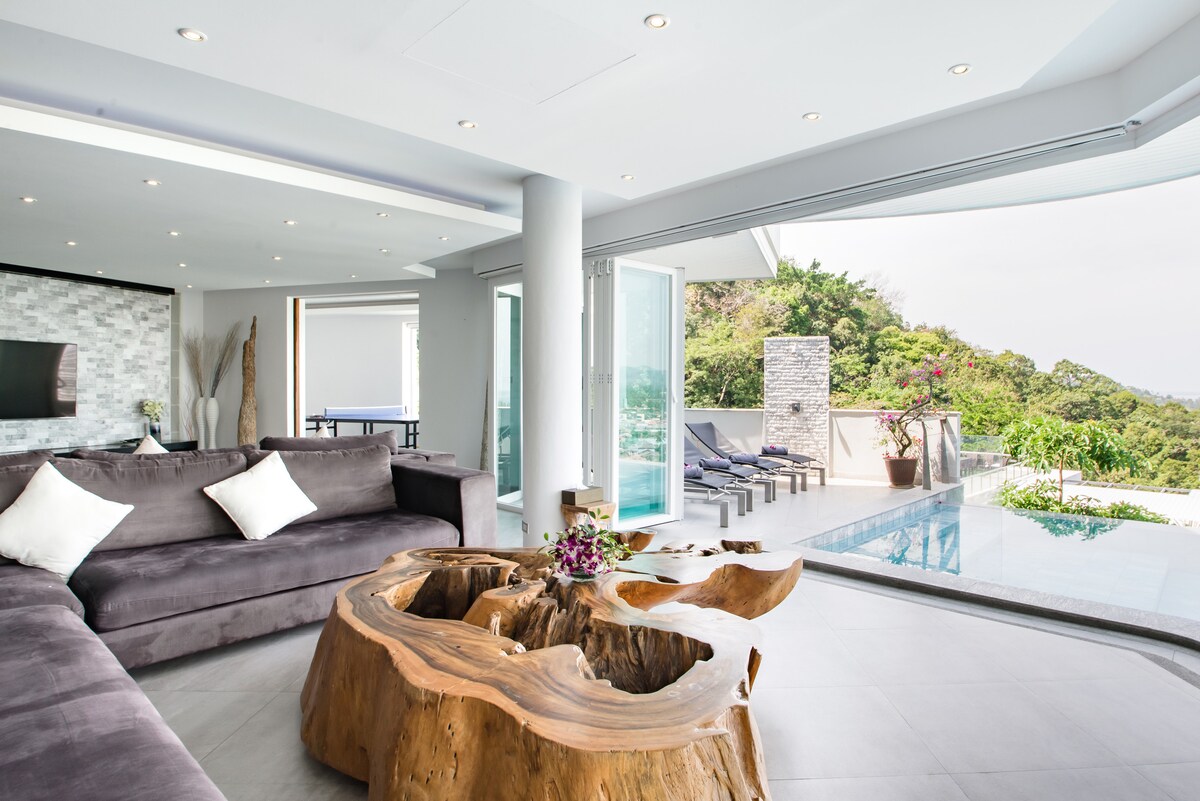 Villa Beyond is an exclusive holiday villa sitting pretty on the mountainside and graced with fabulous views and peaceful surroundings. Hidden away on a private road just a few minutes from Bang Tao, this nine-bedroom villa has an attentive dedicated staff and is an ideal setting for winding down and spending time together.Villa Beyond’s calm ambiance is enhanced by stylish décor, hypnotic views and tropical birdsong in the garden. A blend of natural materials results in a simple but beautiful interior, complemented by bespoke furniture artfully created from wood and metal.
