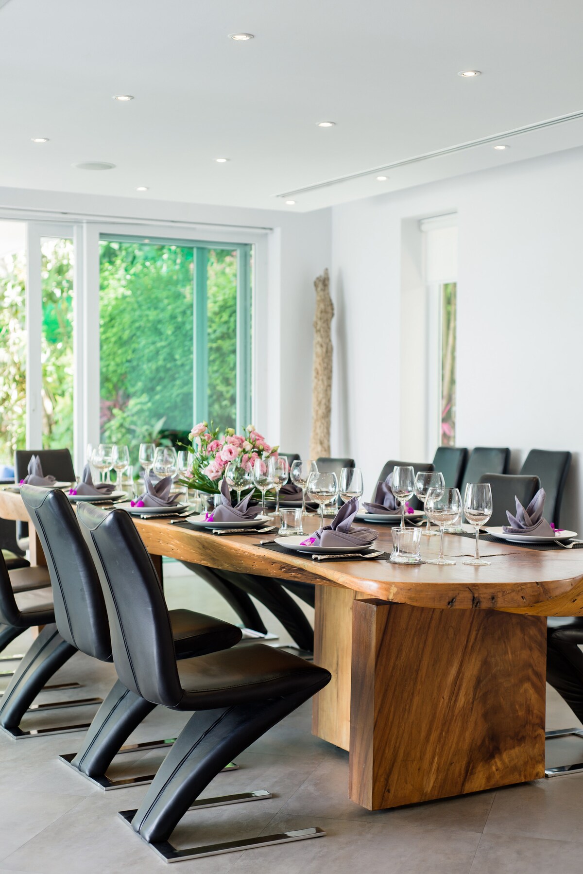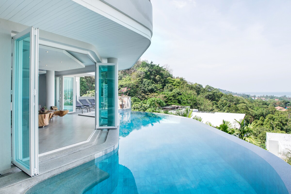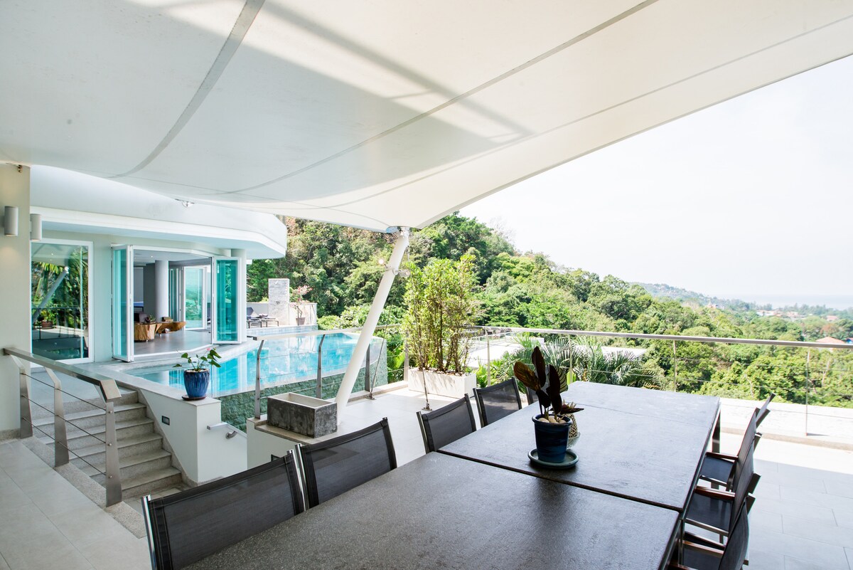 Villa Beyond is an exclusive holiday villa sitting pretty on the mountainside and graced with fabulous views and peaceful surroundings. Hidden away on a private road just a few minutes from Bang Tao, this nine-bedroom villa has an attentive dedicated staff and is an ideal setting for winding down and spending time together.Villa Beyond’s calm ambiance is enhanced by stylish décor, hypnotic views and tropical birdsong in the garden. A blend of natural materials results in a simple but beautiful interior, complemented by bespoke furniture artfully created from wood and metal.