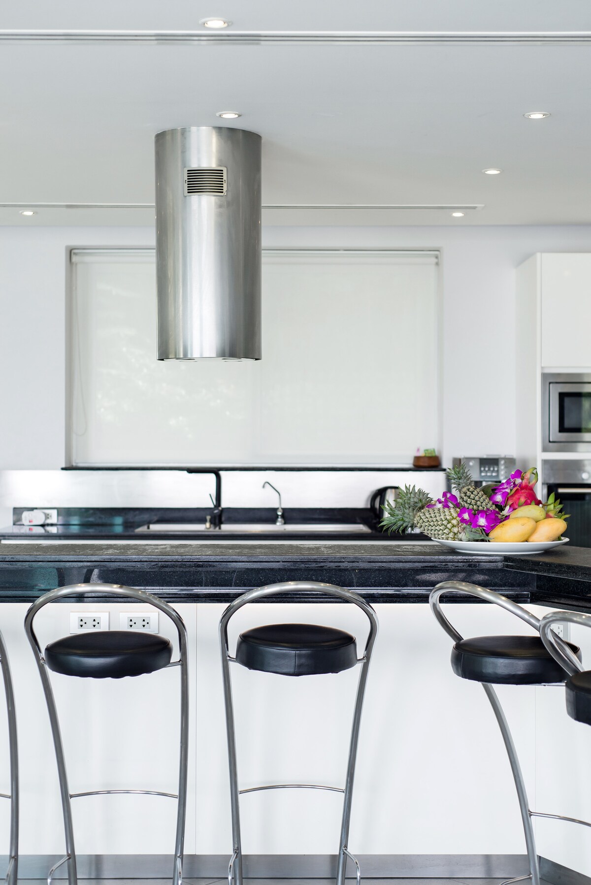 Indoor LivingVilla Beyond’s open-plan living, dining and kitchen area encompasses most of the second level. Large comfortable sofas provide plenty of space for watching movies on the 60-inch TV in the cosy corner lounge, or gazing out over the infinity pool and ocean. Panels of glass doors across the front of the living area fold back to create a tropical indoor–outdoor feel.