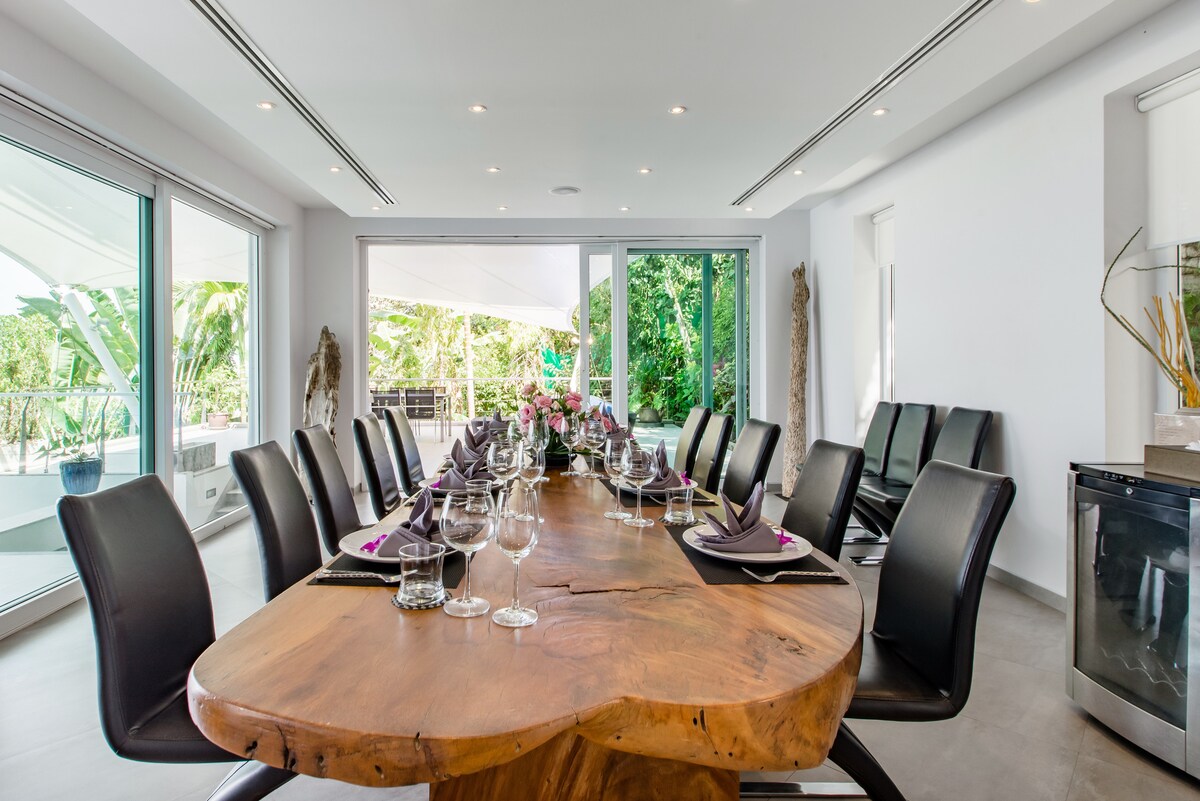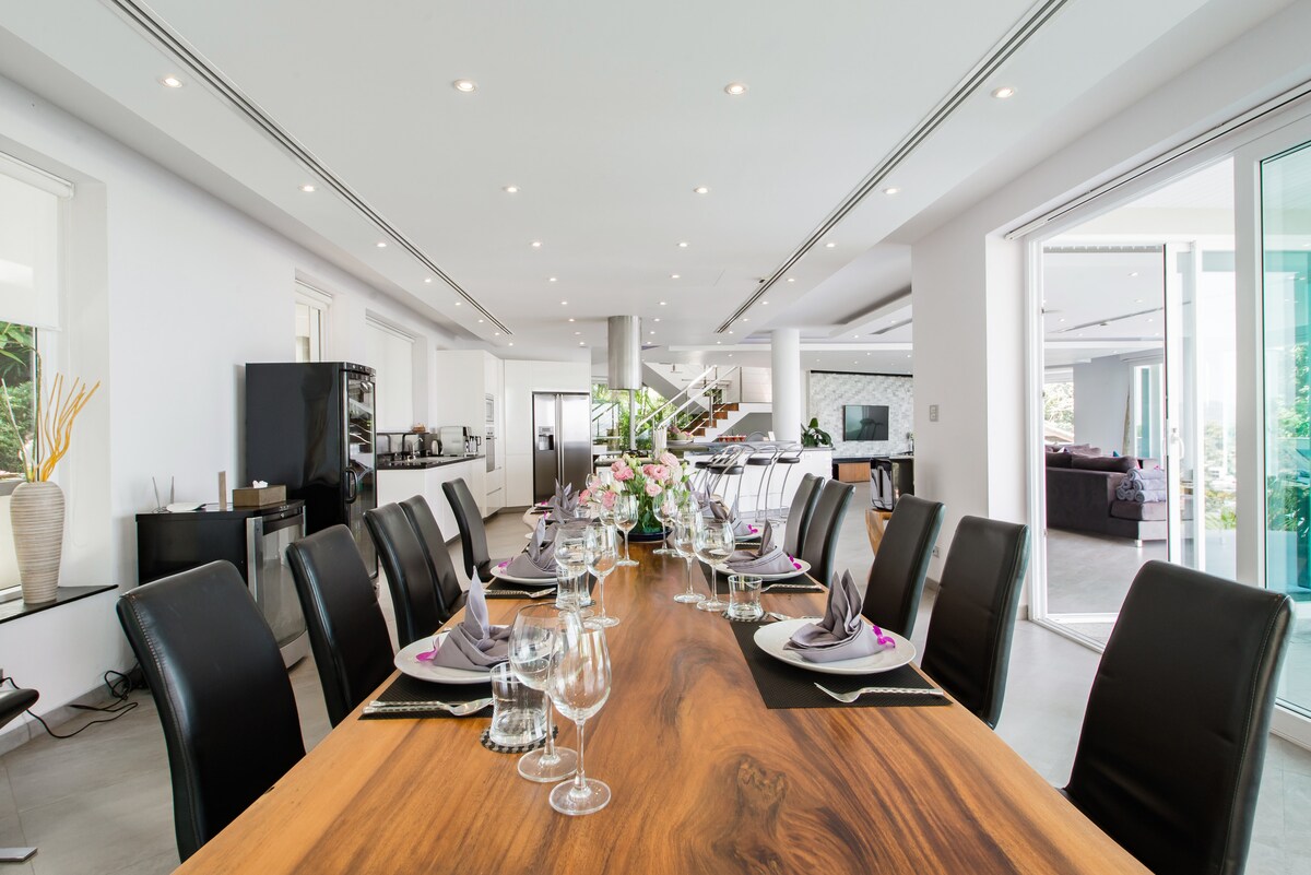 IMPORTANT NOTES The rates shown in Airbnb are for 7-bedroom use for up to 14 guests. Please note the rates are based on the following conditions: - 2 persons sharing per bedroom. - Booking of 14 persons will have use of 7 bedrooms - Booking of 16 persons will have use of 8 bedrooms - Booking of 18 persons will have use of 9 bedrooms If guests require use of rooms with one (1) person occupancy then you need to book for two (2) people to have use of the room. For example, if you are 8 people and need 8 bedrooms...you need to book for 16 guests. If you are 9 people and need 9 bedrooms...you need to book for 18 guests. DUE TO LIMITATIONS ON AIRBNB PLATFORM THE MAXIMUM NUMBER OF GUESTS YOU CAN SELECT IS 16. IF YOU ARE MORE THAN 16 GUESTS OR NEED USE OF BEDROOMS WITH SINGLE USE, YOU NEED TO INFORM US VIA THE CHAT SO WE CAN ADVISE YOU OF ANY ADDITIONAL COST. Bunk bed in bedroom 6, USD 50++ per night (can accommodate up to 2 children under 12 years) - Electricity is included up to 300 units per day which is plenty with normal usage and turning the AC off when not in the room. Further units are 7 Baht per unit. - Airport transfers can be arranged for 1,200THB per van per way. Required: 1000 USD or any currency equivalent to 1000 USD as security Deposit on arrival. The villa is 9 bedroom all with full private bathrooms and can comfortably fit up to 18 people sleeping in the existing beds. 6 bedrooms have a sofa beds or extra beds which we could set up at USD50++ per bed per night. Further extra beds are available upon request. Villa Beyond is set up with a spacious living room, dining room, kitchen gym and game room and pool on the living floor. There are 4 bedrooms above and a 2 bedrooms below. The rooftop is connected with a separate entrance and there are 3 further bedrooms and large terrace area with small kitchen. Villa Dining Villa Beyond offers a tempting menu of Thai specialities and Western dishes. A full wine, spirits and soft drinks menu is also available. Guests are encouraged to plan their meals together with the villa chef, ideally a day in advance to allow time to buy groceries and prepare meals. To cover the grocery shopping costs, guests are asked to provide a cash float in advance, and staff will keep all receipts from their shopping for reference. A chef or in-villa shopping service is available for THB 800, covering a grocery cost of up to THB 4,000. For grocery expenses exceeding THB 4,000 a handling fee of 20% will apply. Required: 1000 USD or any currency equivalent to 1000 USD as security Deposit on arrival.