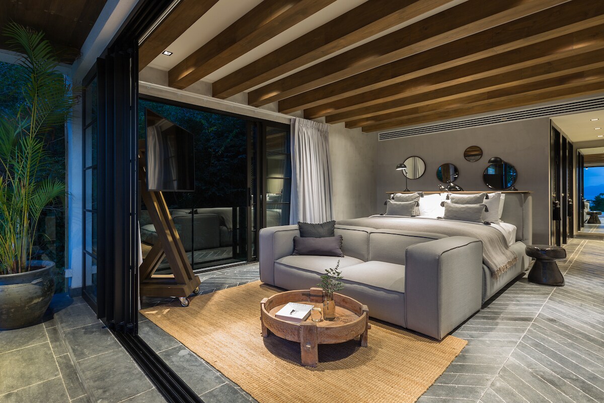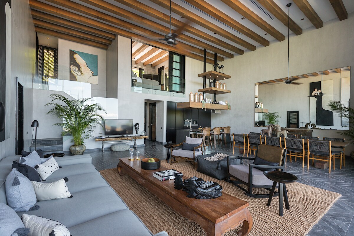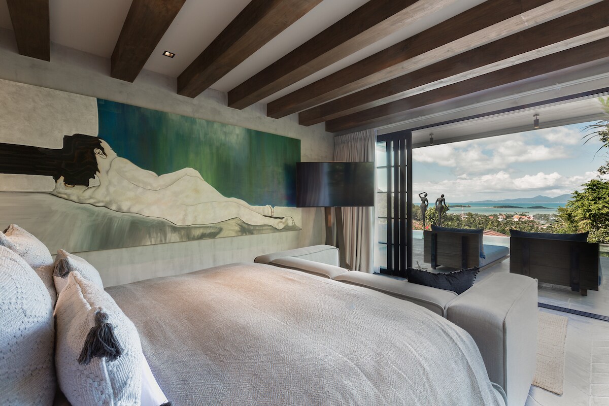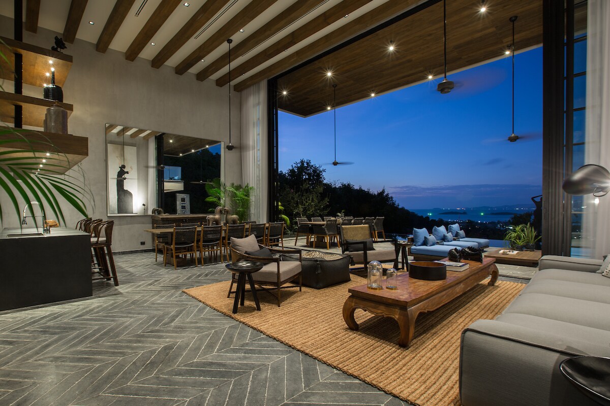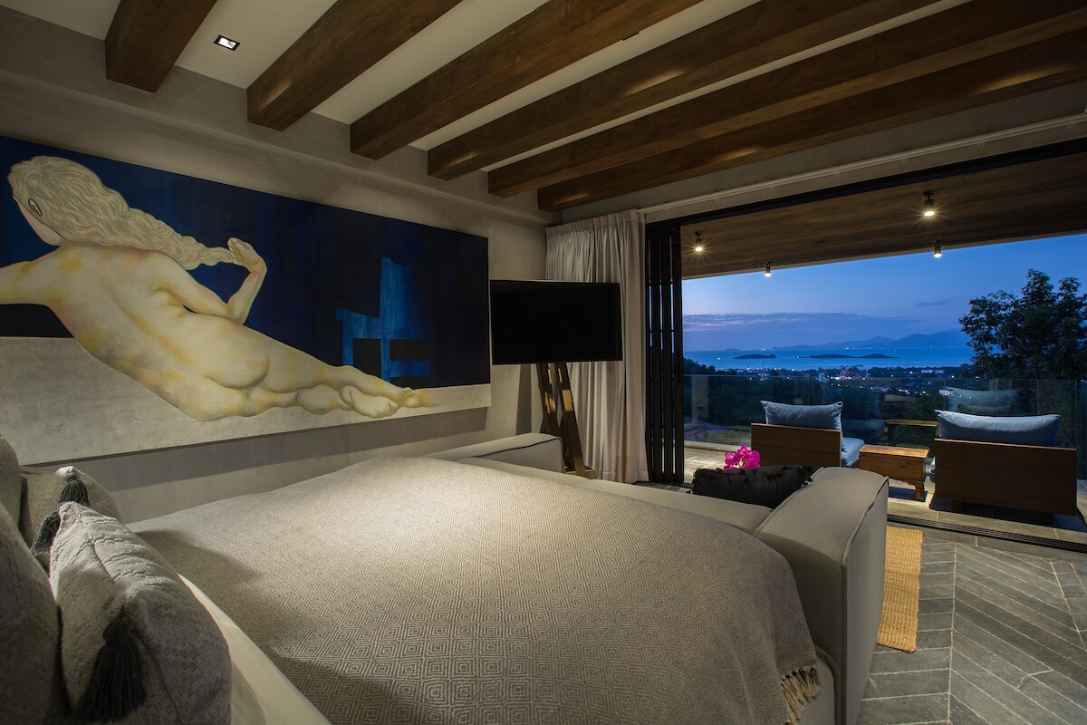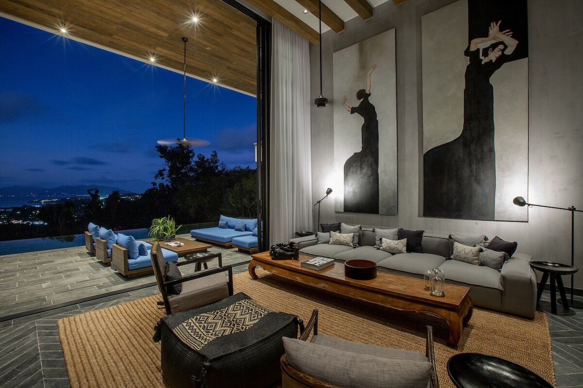 The villa is arranged over two floors with 400 square metres of total living space, houses the uniquely designed, open-plan 150 square metre lounge with impressive six-metre-high teak-beamed ceilings. The entire width of the house incorporates a grand open-plan living area including the kitchen, dining and sumptuous lounge area, and is fronted by floor to ceiling sliding glass doors leading onto the magnificent terrace and vista. The grey marble and limestone terrace features an impressive 14 by 3.5-metre infinity pool, inlaid with the same grey marble limestone and complete with jacuzzi jets and in-water seating, and truly appreciating the seductive sea views over Koh Phangan. The hardwood exterior furniture comprises sunbeds, sofa sets and a dining table for up to 12 guests.