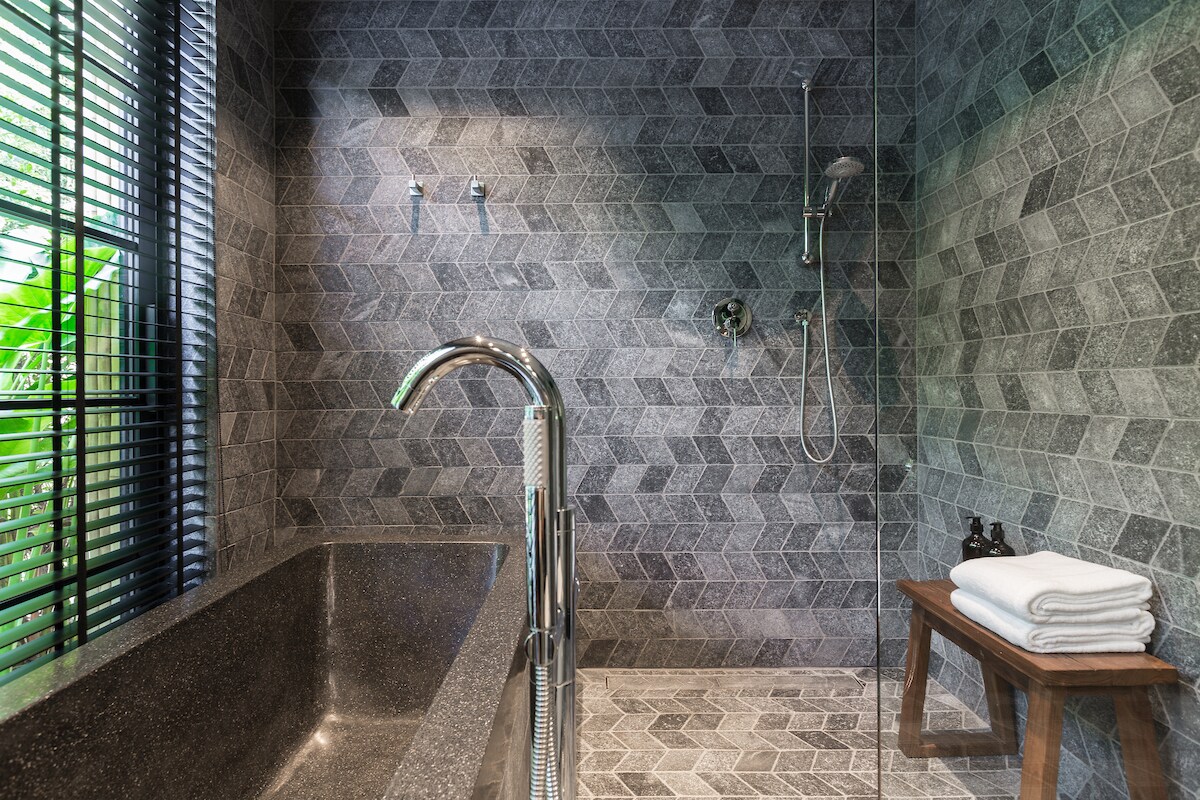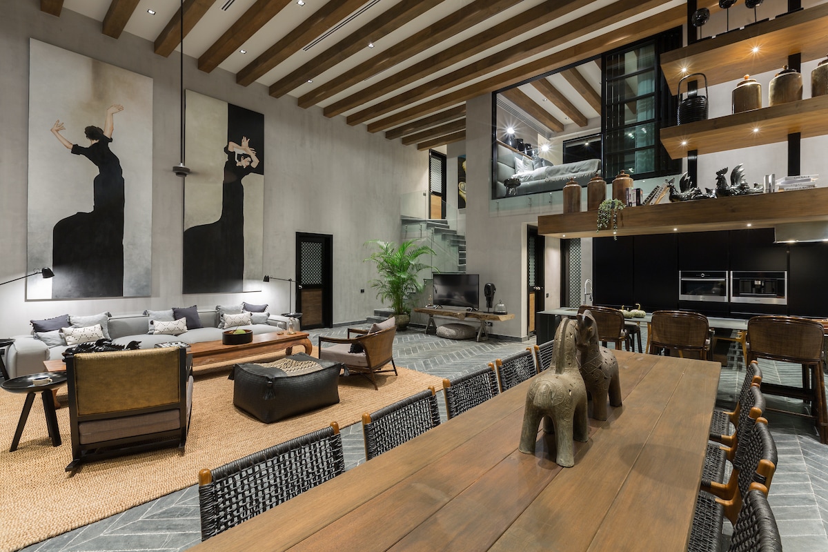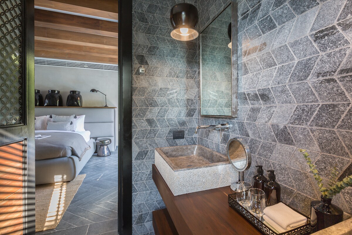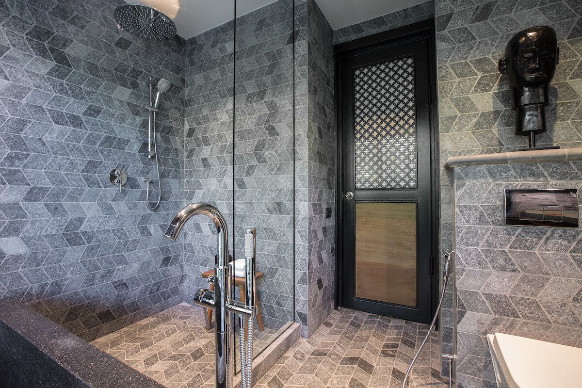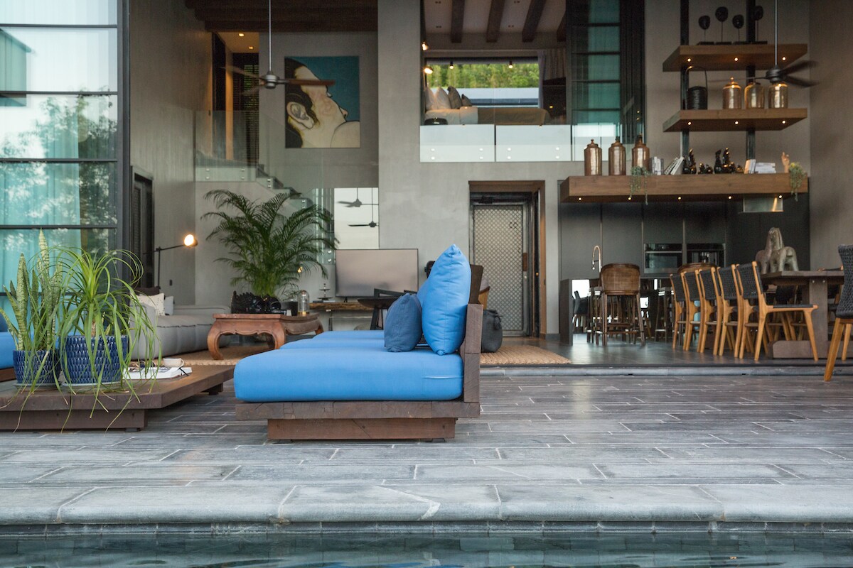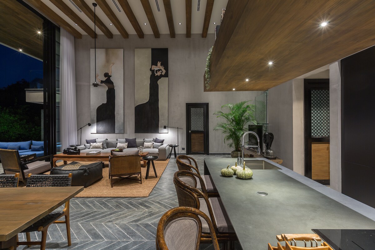 The villa is arranged over two floors with 400 square metres of total living space, houses the uniquely designed, open-plan 150 square metre lounge with impressive six-metre-high teak-beamed ceilings. The entire width of the house incorporates a grand open-plan living area including the kitchen, dining and sumptuous lounge area, and is fronted by floor to ceiling sliding glass doors leading onto the magnificent terrace and vista. The grey marble and limestone terrace features an impressive 14 by 3.5-metre infinity pool, inlaid with the same grey marble limestone and complete with jacuzzi jets and in-water seating, and truly appreciating the seductive sea views over Koh Phangan. The hardwood exterior furniture comprises sunbeds, sofa sets and a dining table for up to 12 guests.