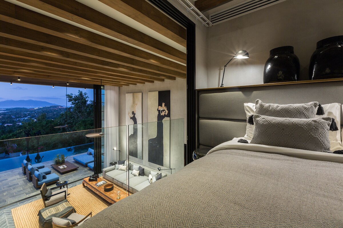 Three luxurious sea view bedrooms are located in the main house: one downstairs adjacent to the living area with views through floor to ceiling glass doors, across the infinity pool and the lush-green Nature Reserve of protected tropical forest; one upstairs bedroom has an exterior terrace closed with a glass panels to maximise the sea views, the other upstair bedroom overlooks the ground floor living space to access that sought after sea-view and boasts a private balcony to the rear with two sunbeds.