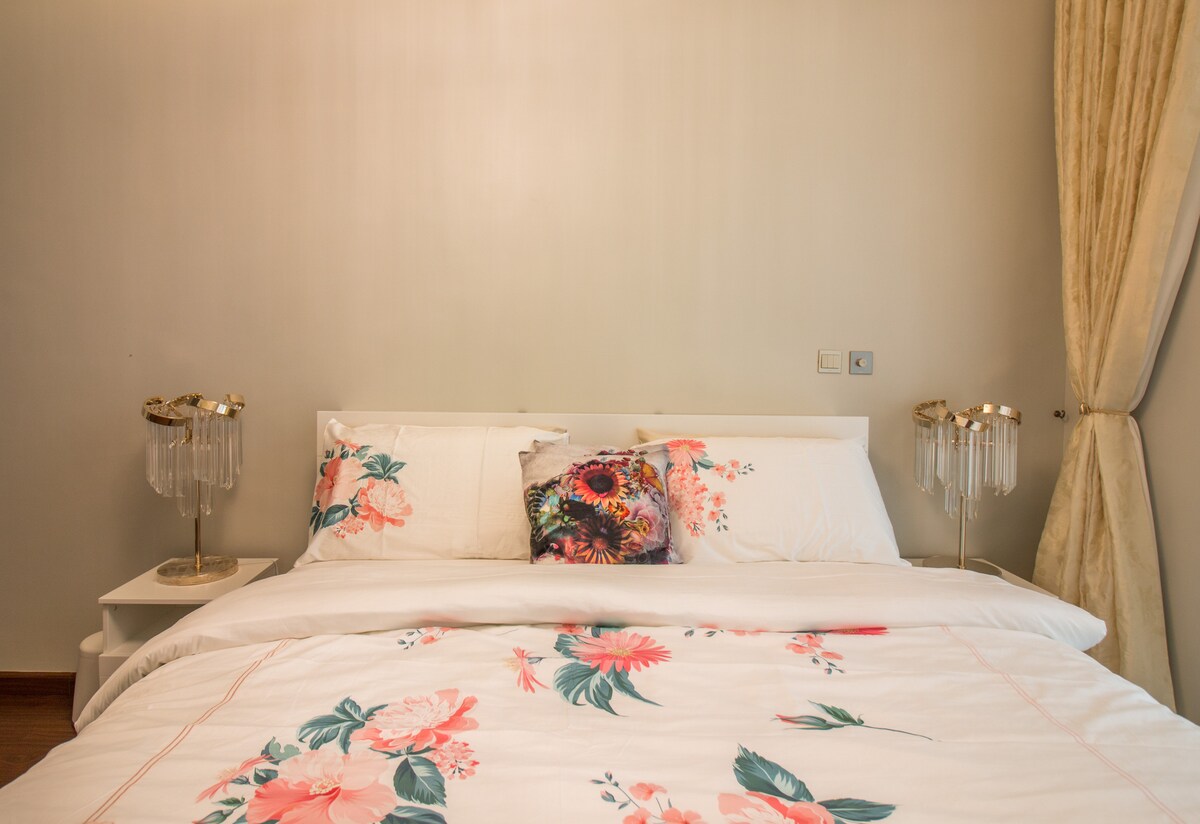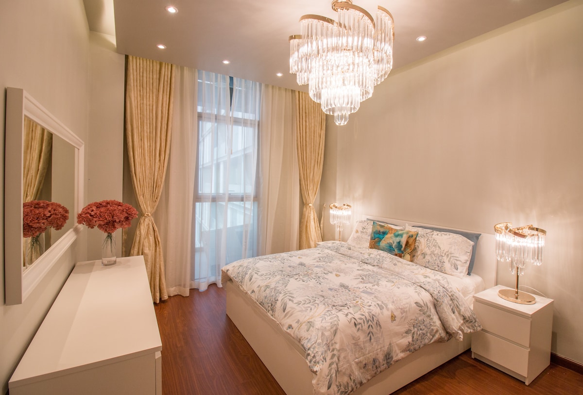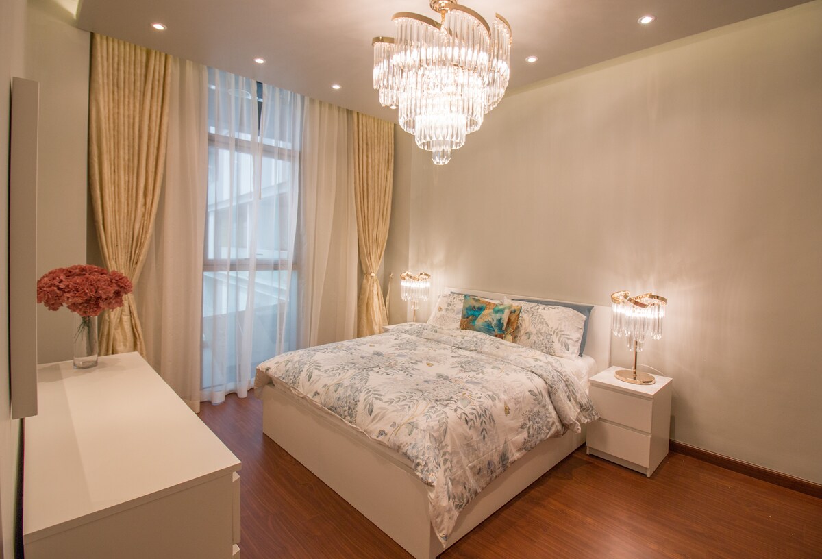 Master bedroom with a queen-size bed, wardrobe, and natural light.