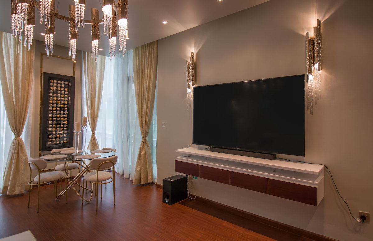 Open-plan living and dining area with cozy seating and a flat-screen TV 📺.