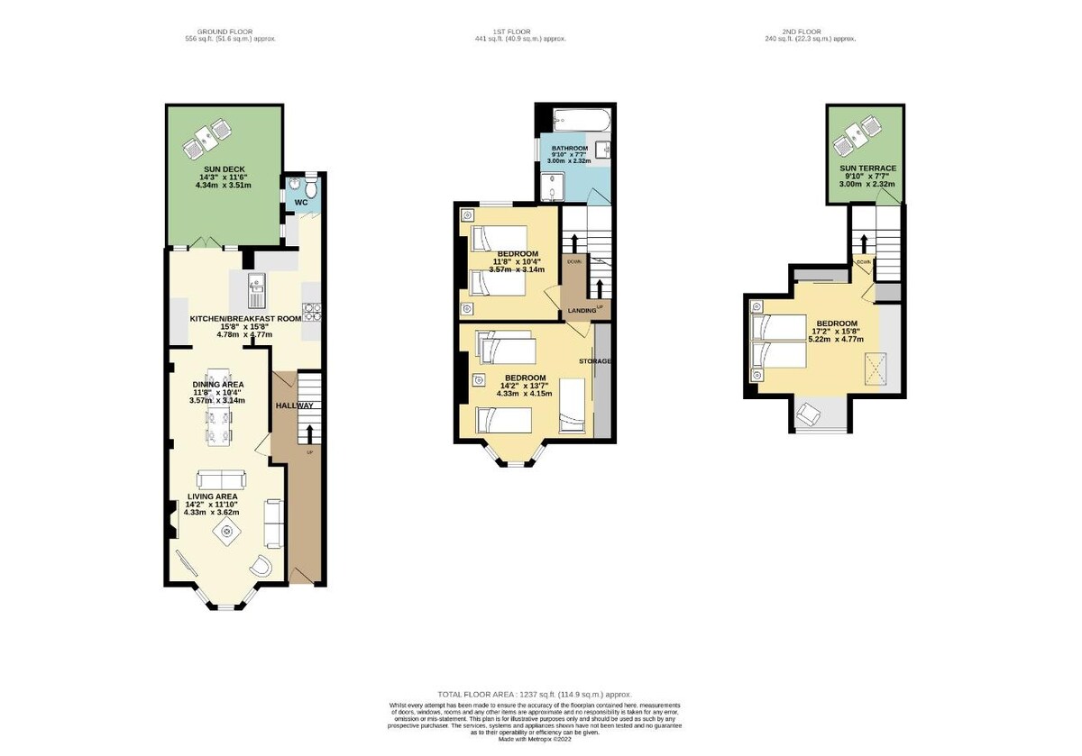 2 single beds, 1 bunk bed