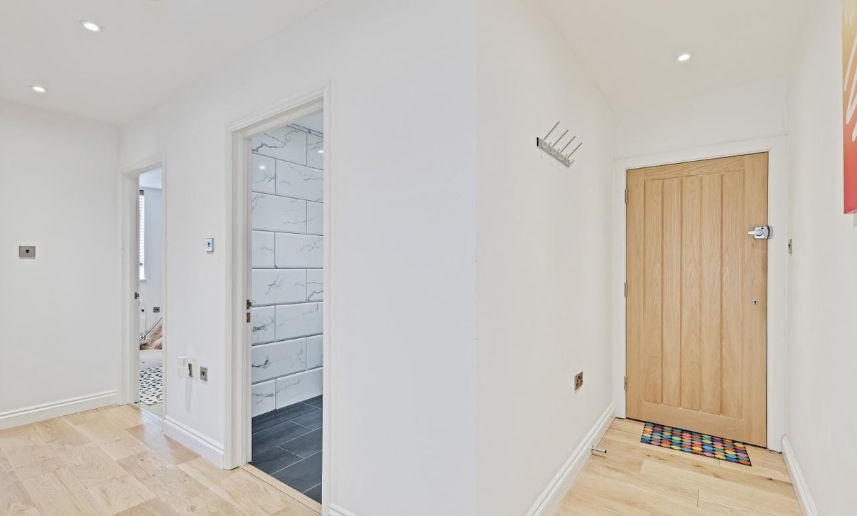 Enter through the apartment door into the spacious hallway with the living room directly in front of you.