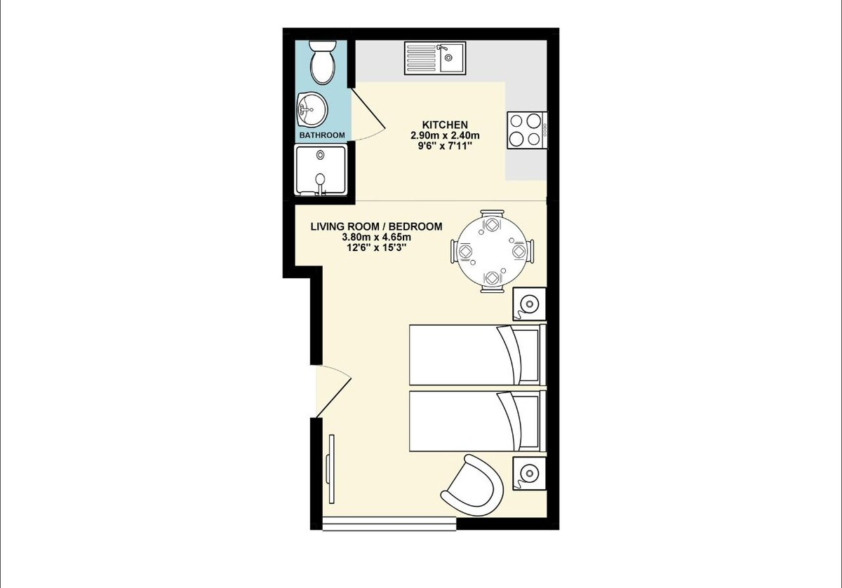 Through the front door and straight into the studio space with zip and link beds which can be made as two singles or a large double.