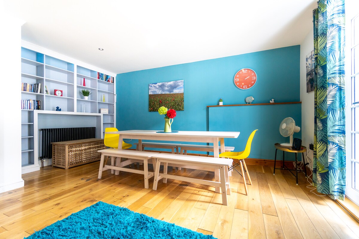 • Lounge/dining table area. Large dining table with six chairs plus a further two stools to accommodate all eight guests. The 40 inch flat screen SMART TV means you can connect to iplayer, netflix etc. Three seater sofa. Our bookshelves are stacked with good books to read and with original Brighton photography on mounted canvas on the walls throughout, you really will feel the Brighton vibe.