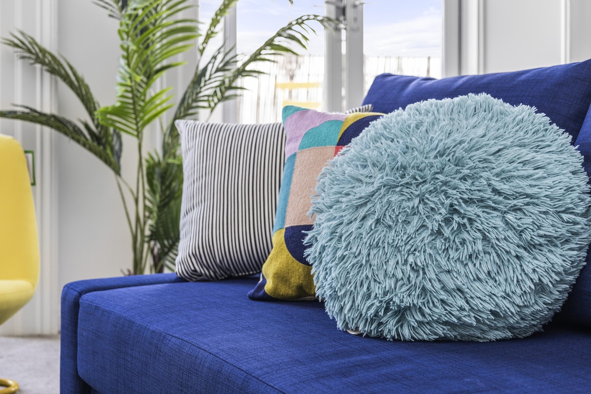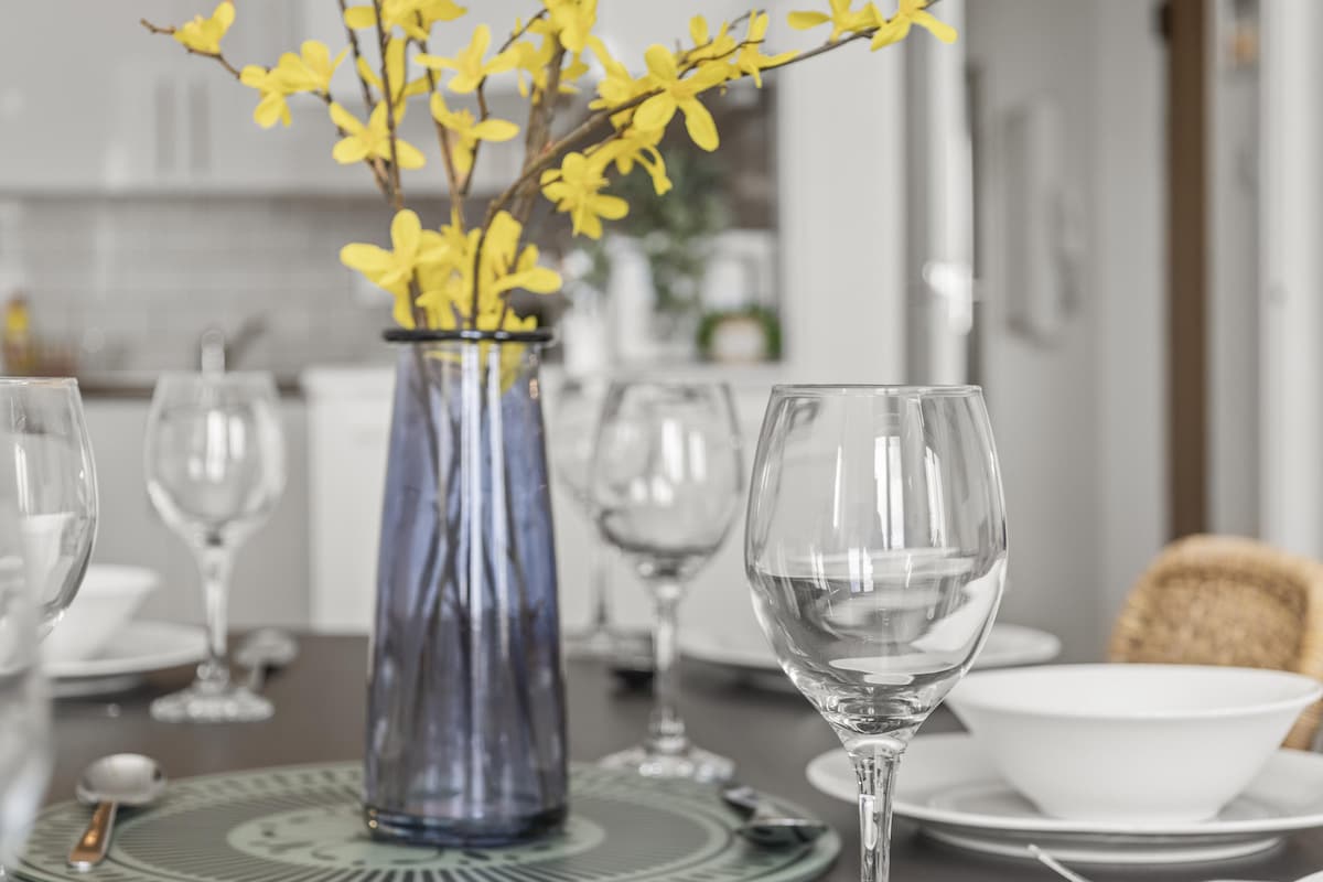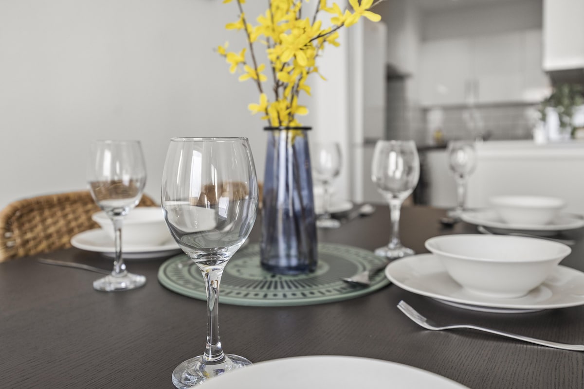The dining area has a ton of natural daylight pouring in and the fully equipped kitchen has a washing machine, microwave, oven, kettle, plus plenty of cookware, glassware, crockery and cutlery so you can easily cook up a brunch or lunch for everybody. In addition to this we offer complimentary tea and coffee, salt and pepper - so please help yourself. The dining table seats up to 6 guests.