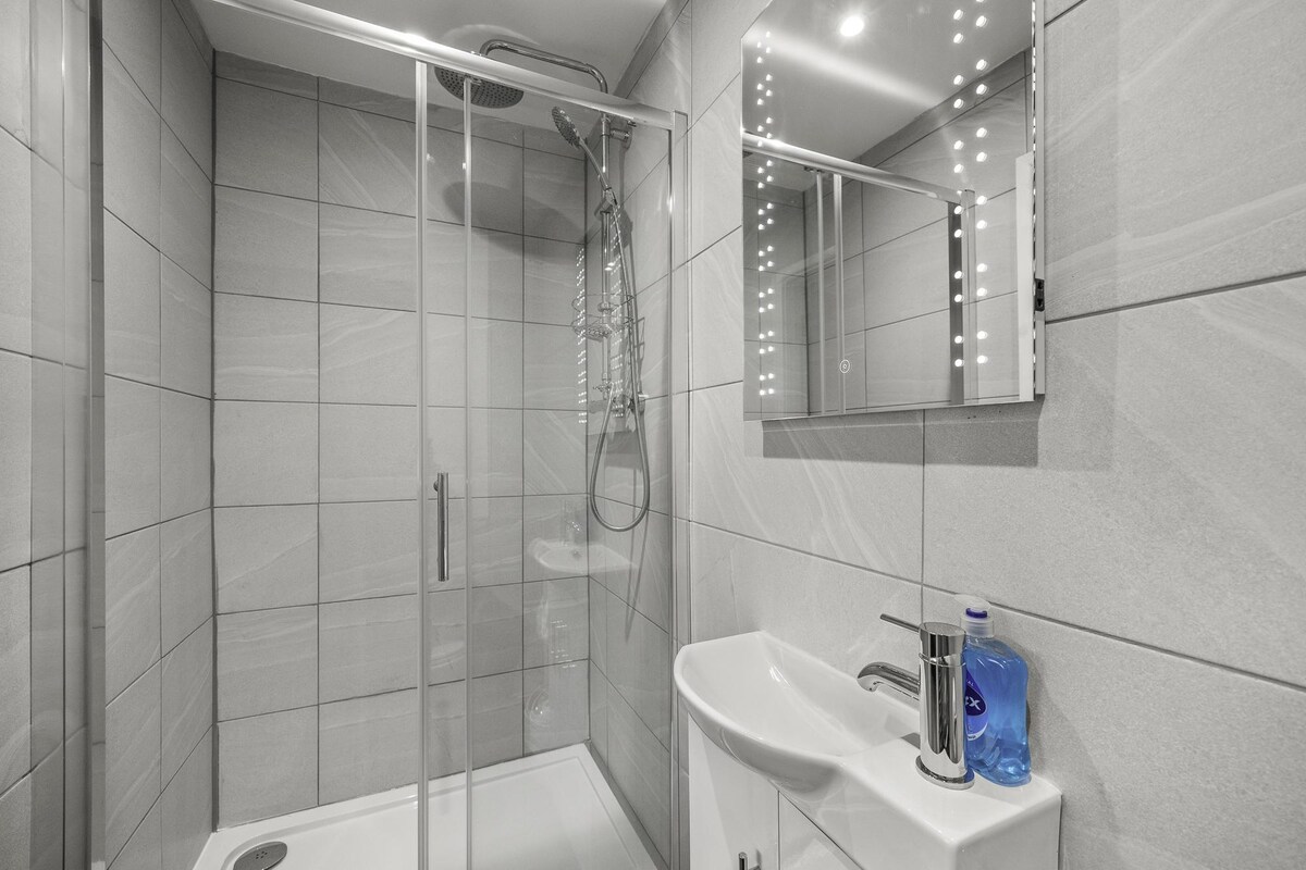 - The ensuite in the ground floor bedroom has a shower, sink, mirror and toilet