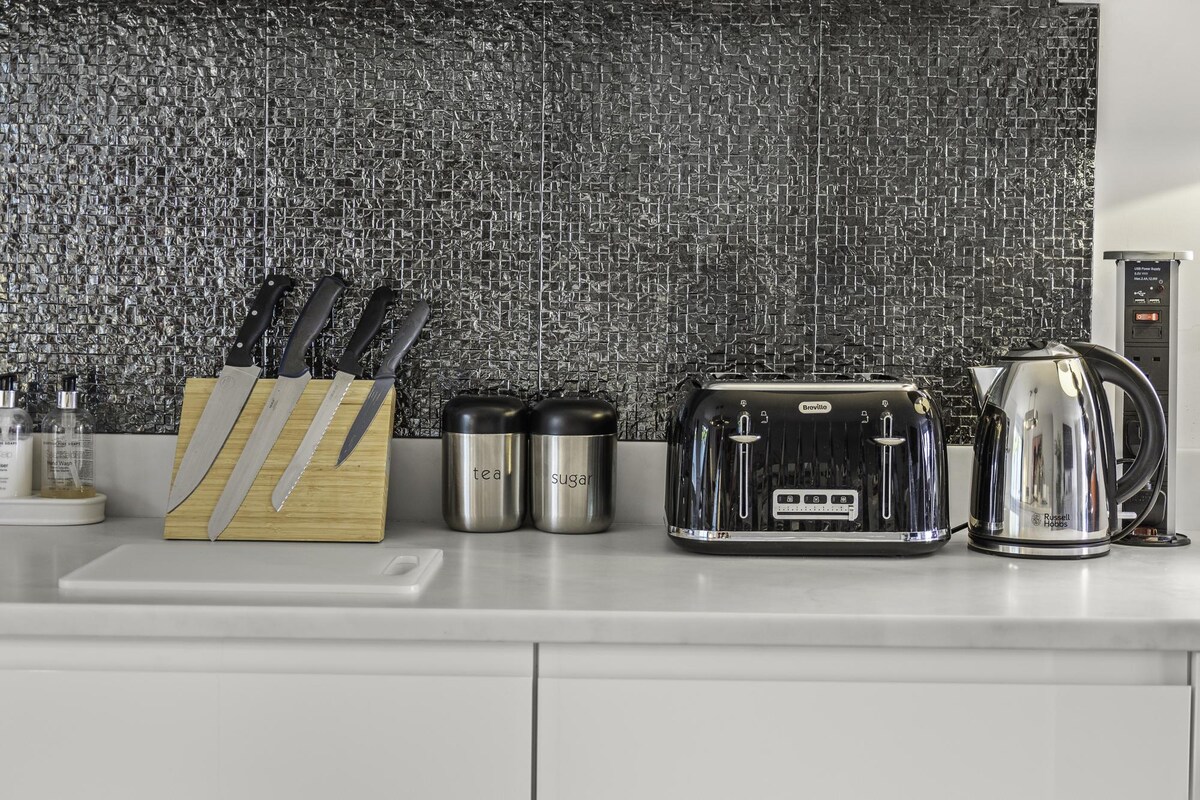 The dining area has a tonne of natural daylight pouring in from the patio garden, please note - access past the gate is not for guest use. The fully equipped kitchen has an induction hob, integrated fridge/freezer and breakfast bar plus plenty of cookware, glassware, crockery and cutlery so you can easily cook up a brunch or lunch for everybody. In addition to this we offer complimentary tea and coffee, salt and pepper - so please help yourself.