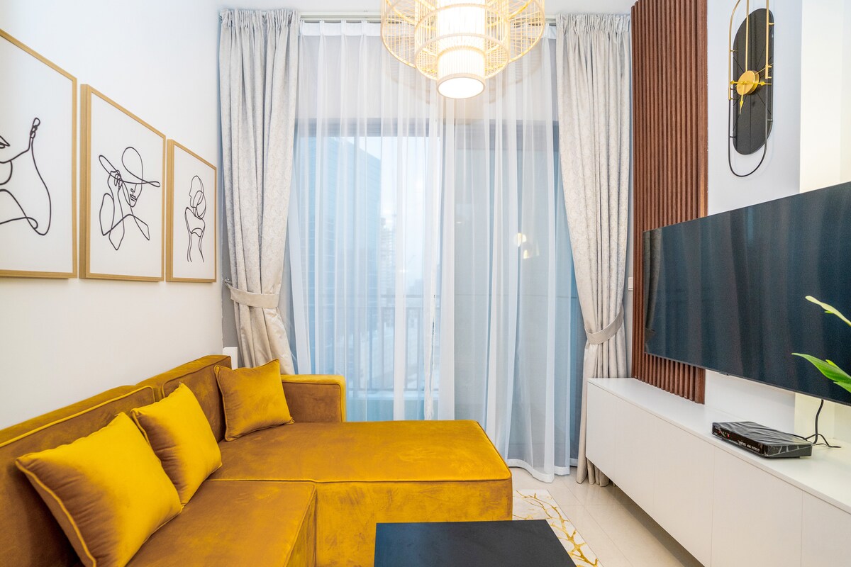 Living Area: Stylish, open-plan living with a smart TV, seating area, and incredible views of the Dubai skyline 🌇