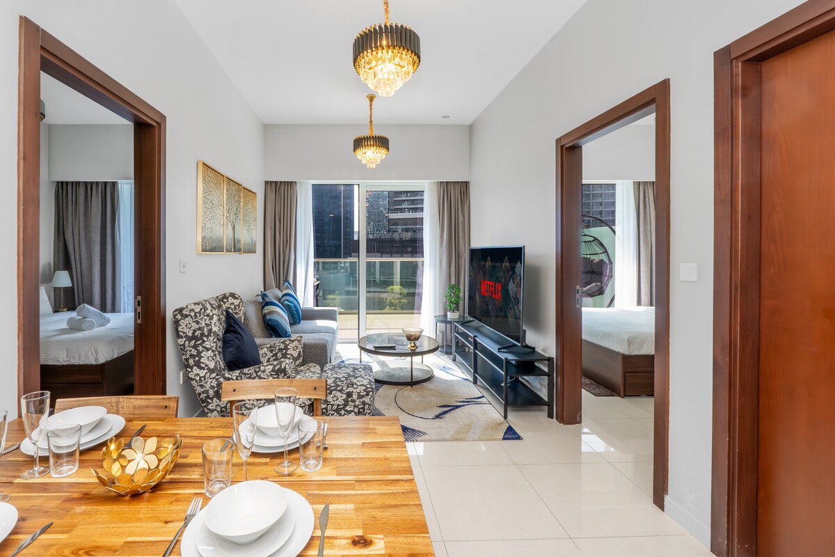 In the newly-developed Reva Residence by DAMAC Properties, this gorgeous 2-bedroom apartment is fully furnished with all the amenities you need for a luxuriously comfortable stay. Suited for couples, small groups of friends and families, the tower itself is set just across from the Dubai water canal. This apartment offers some tranquil respite within the bustling Downtown area. It is in proximity to attractions such as the Burj Khalifa and Dubai Mall, which are just 8 minutes by car, and Dubai International Airport, a quick 14-minute drive.