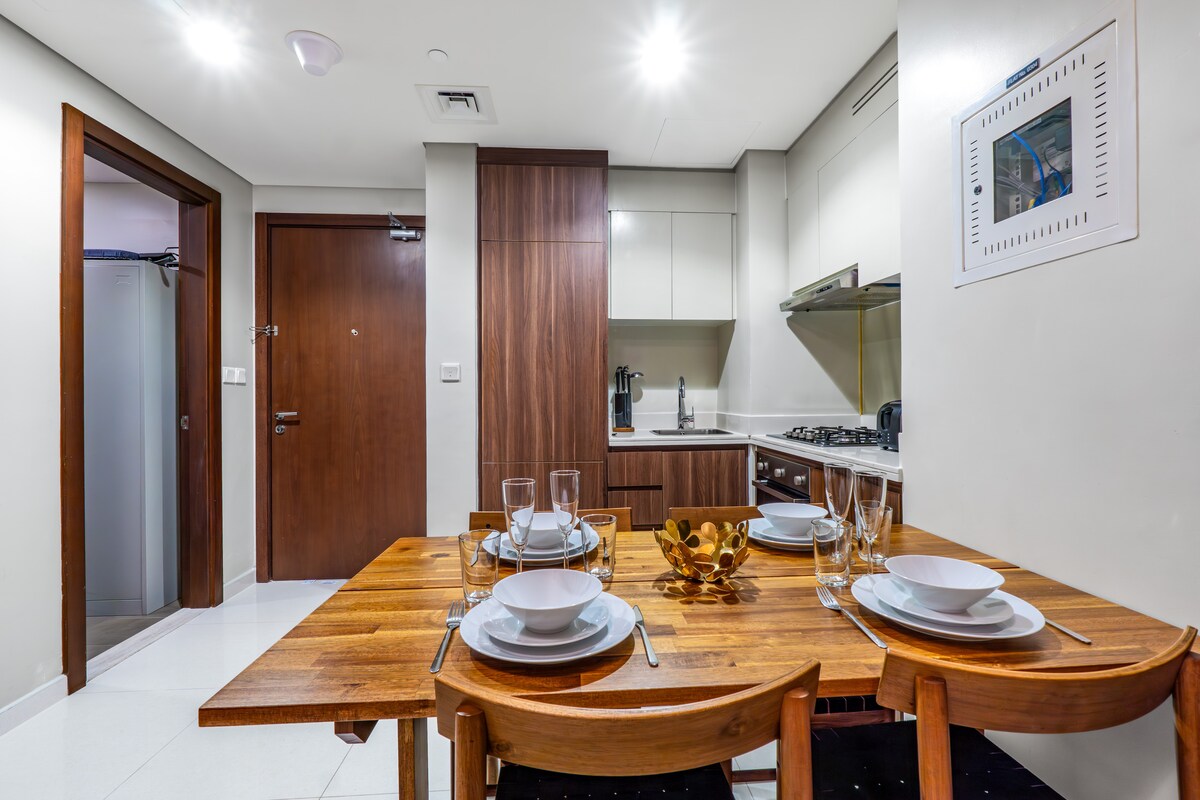 Invite yourself and unwind over the sofa in the living area and stream all your favourite shows on the TV. Whip up delicious meals in the fully-equipped kitchen, and enjoy a complimentary brew with the coffee machine provided. The dining table seats 4 people; it can be used as an additional space for meal prep or digital work on a portable device. Outside, a private balcony with a slight swing chair and lounge seating offers the perfect place to relax, hold intimate conversations and marvel at the Burj Khalifa.