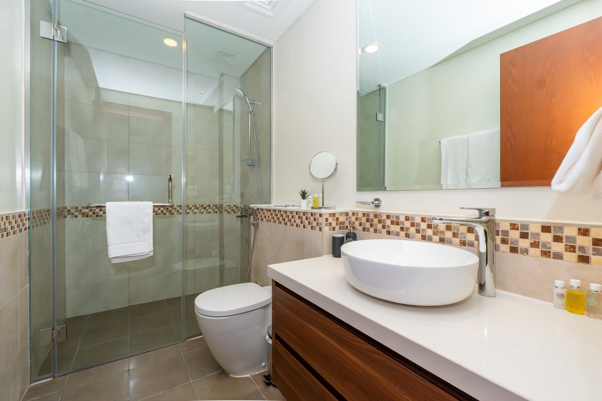 The two bedrooms are fitted with stylish decor, a queen-sized bed lined with complimentary hotel-quality linens, and a built-in wardrobe. Additionally, two bathrooms are equipped with the same large walk-in shower and come with toiletries and fresh towels for your convenience.