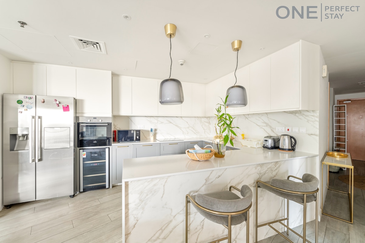 Fully equipped with high-end appliances: refrigerator, oven, microwave, dishwasher, and all the essentials for home cooking.