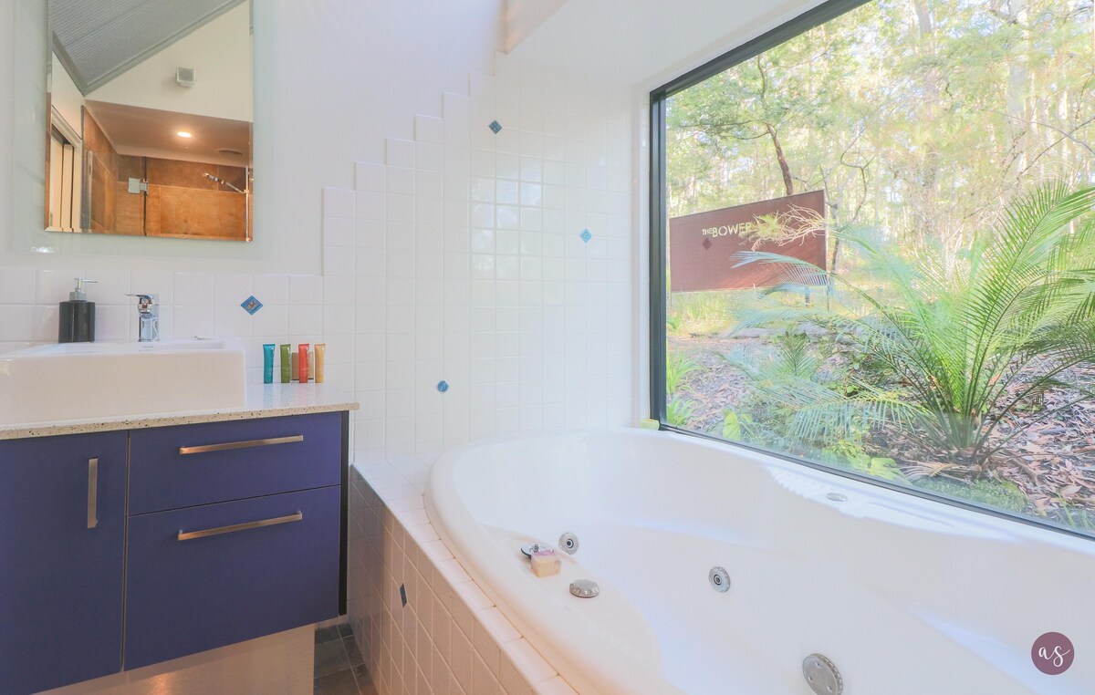 The Ultimate Spa Bower is fully self-contained for self catering in a fully equipped modern kitchen, bathroom (with double spa-jacuzzi), private deck (with gas barbeque) and wood fire place. Amenities include a full laundry, 2 x king size bed(s) and flat screen LCD Digital Video [DVD] players including CD audio capability, for guests enjoyment**The Ultimate Spa Bower at The Bower Broulee** is a luxurious, self-contained retreat nestled in the privacy of a secluded South Coast forest — a true haven for couples or close friends seeking space to reconnect, unwind, and immerse themselves in nature.
