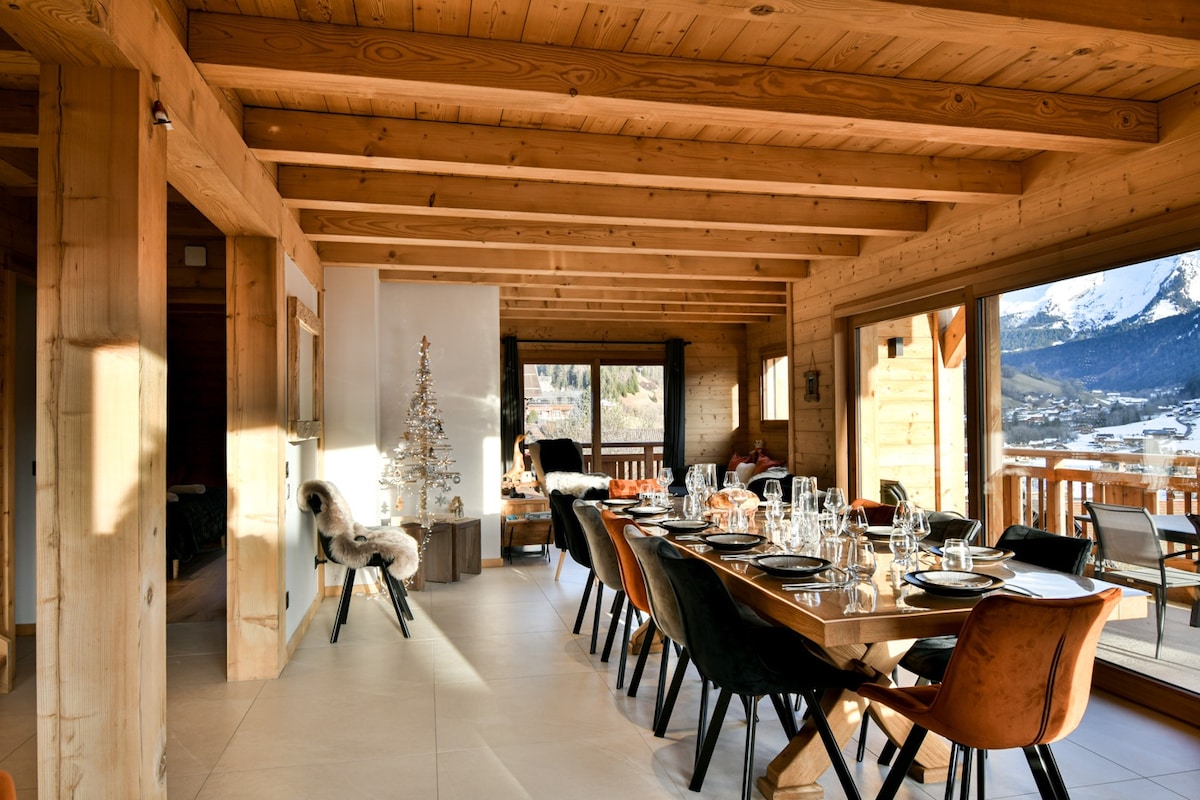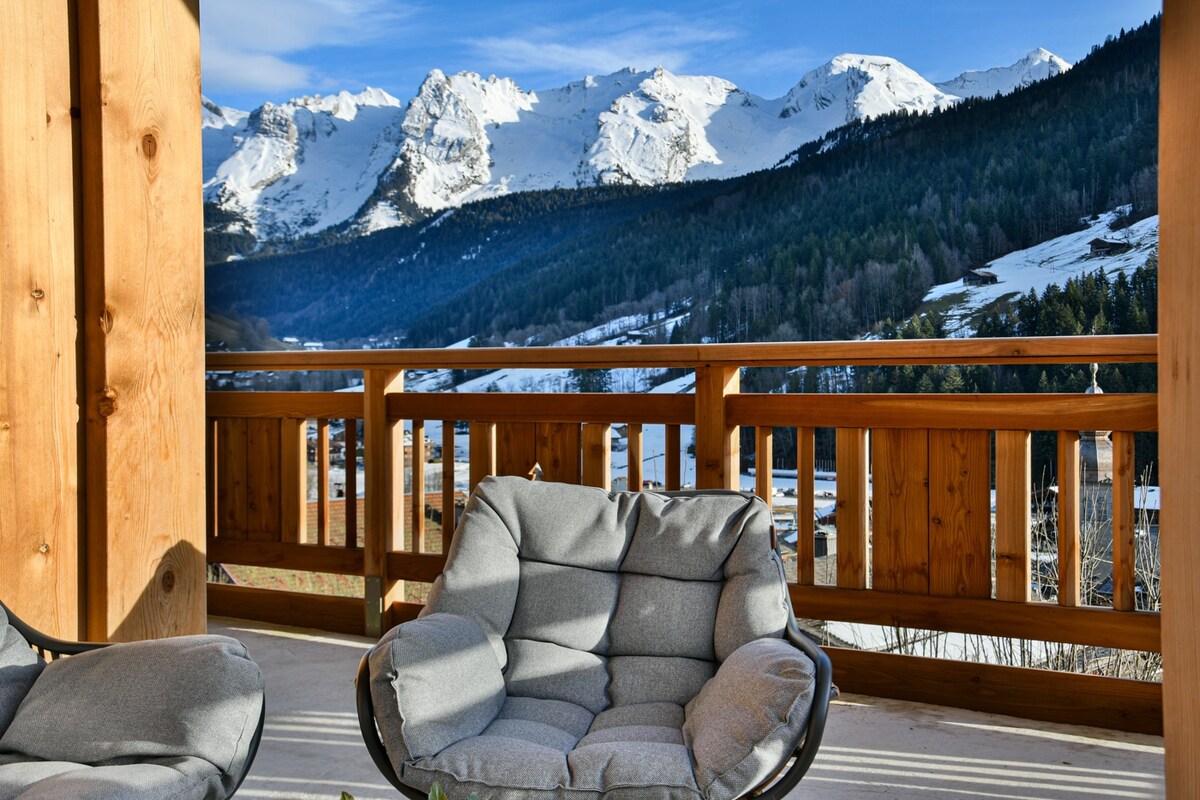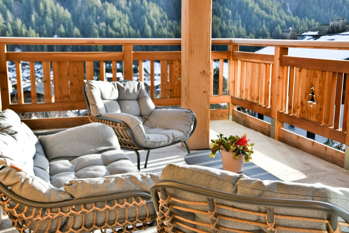 The large balcony is the perfect place to unwind after a day on the slopes, with a seating area for relaxing and a large table for convivial outdoor meals.