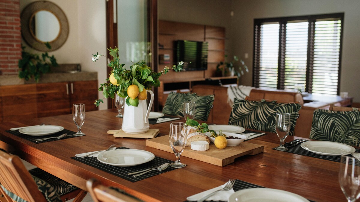 The heart of the home is the open-plan kitchen and lounge, ideal for shared meals and conversation. A separate scullery with a dishwasher, washing machine, and dedicated washing-up area keeps the main space open for gatherings. The kitchen is fully equipped with a refrigerator, stove, oven, microwave, dishwasher, freezer, coffee, hot water kettle, toaster, wine glasses, baking sheet, cooking basics, and a dining table for relaxed family meals.