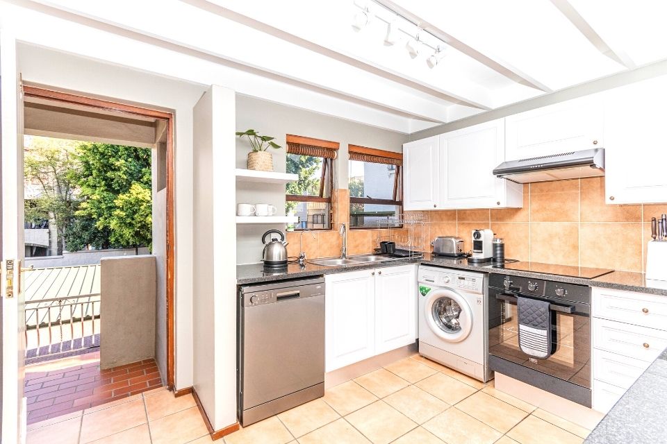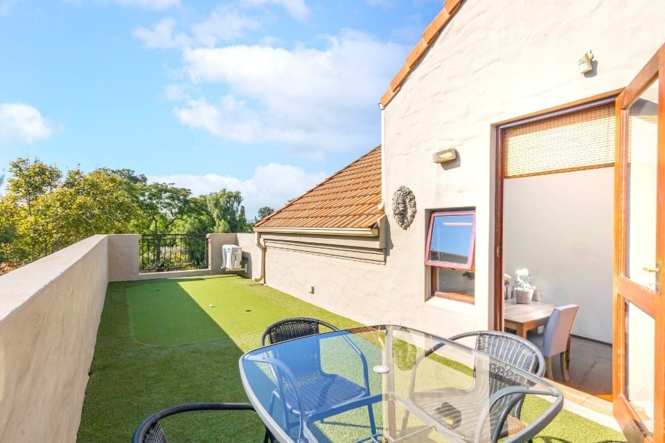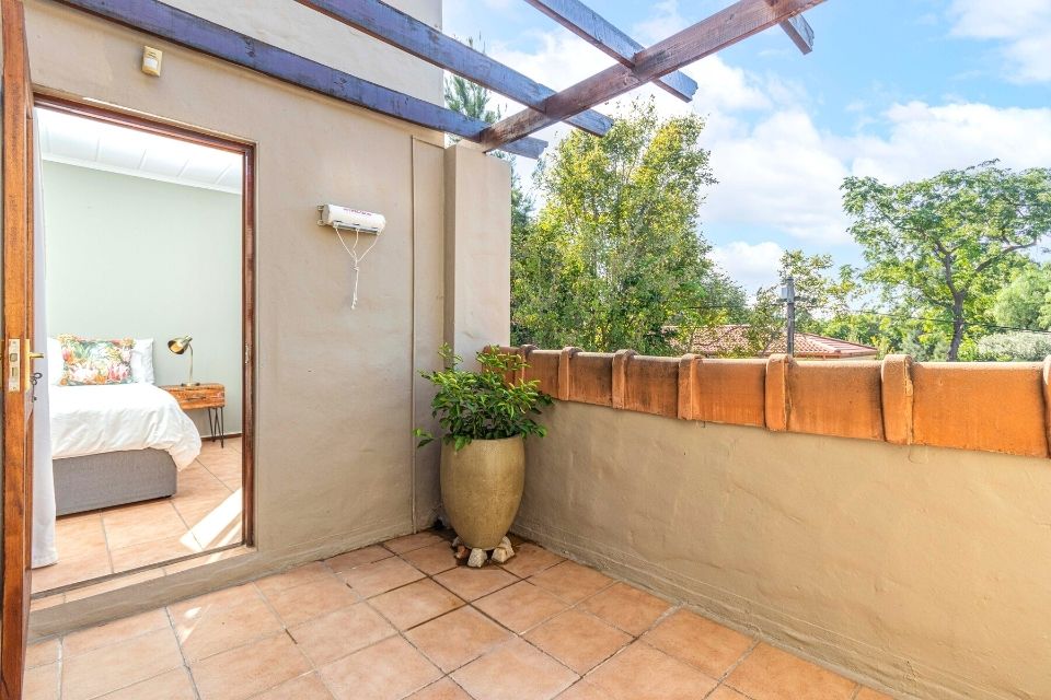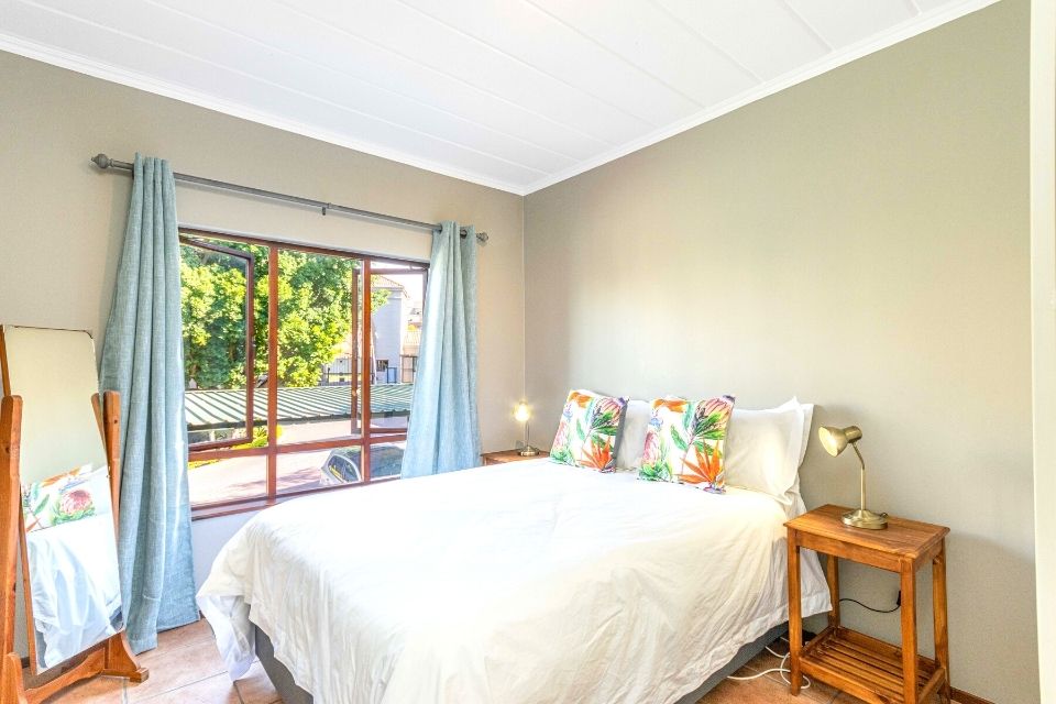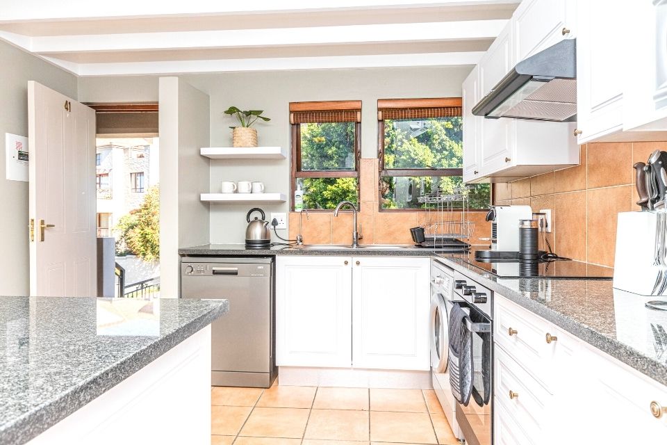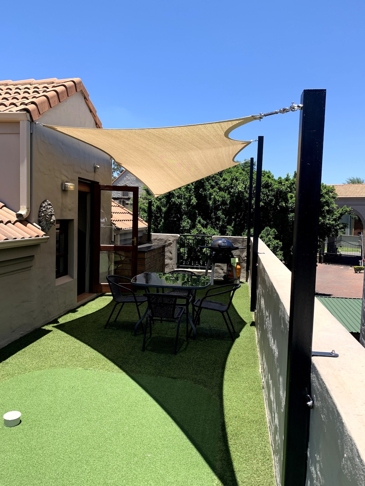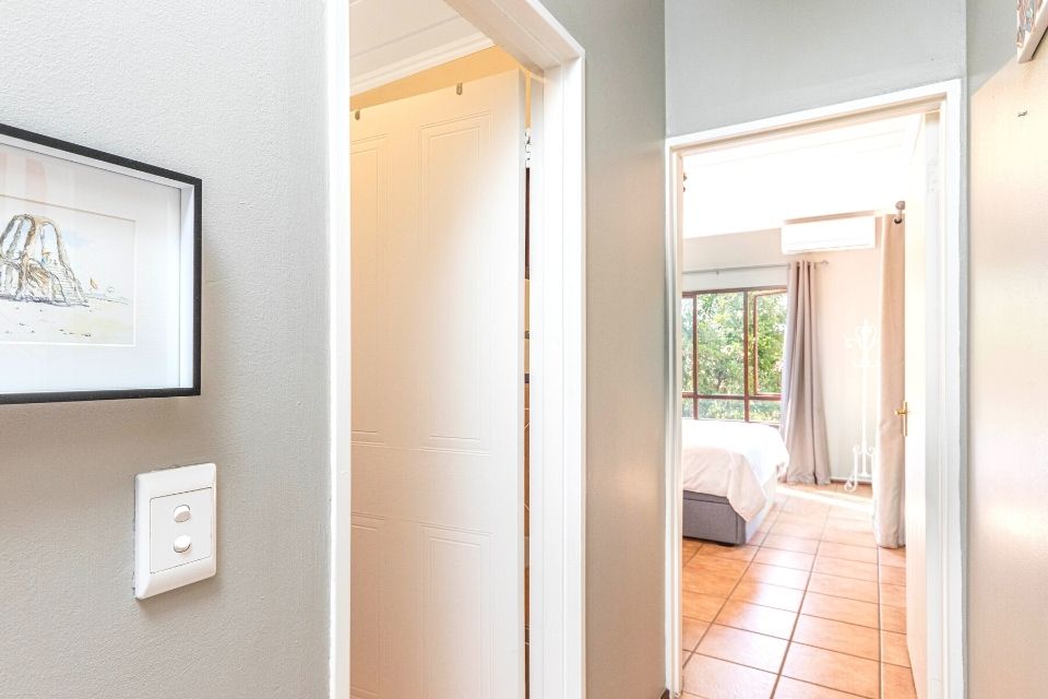Experience gorgeous sunshine and tranquility in this modern 2 bedroom, 1 bathroom loft apartment located in a secure and exceptionally well maintained estate in Paulshof. Enjoy the outdoors with 2 private balconies and a mini astro turf putting green. It comes fully equipped including a smart TV with Netflix, DStv Stream, YouTube and more, uncapped WIFI, dishwasher and a Nespresso machine. Cleaning included twice a week by the awesome Lizzy.The space comprises of a granite top kitchen with centre island, dining room, workspace, 2 well-sized bedrooms, full bathroom and small balcony. Upstairs you have a 58’’ smart TV lounge that comfortably seats all guests, another workspace and large terrace with a putting green, outdoor furniture and gas braai. Access to a stunning communal swimming pool, tennis court and clubhouse (which can be rented for functions). You have 1 under covered parking bay and there is tons of visitor parking in the estate. The storage under the stairs is for private use.
